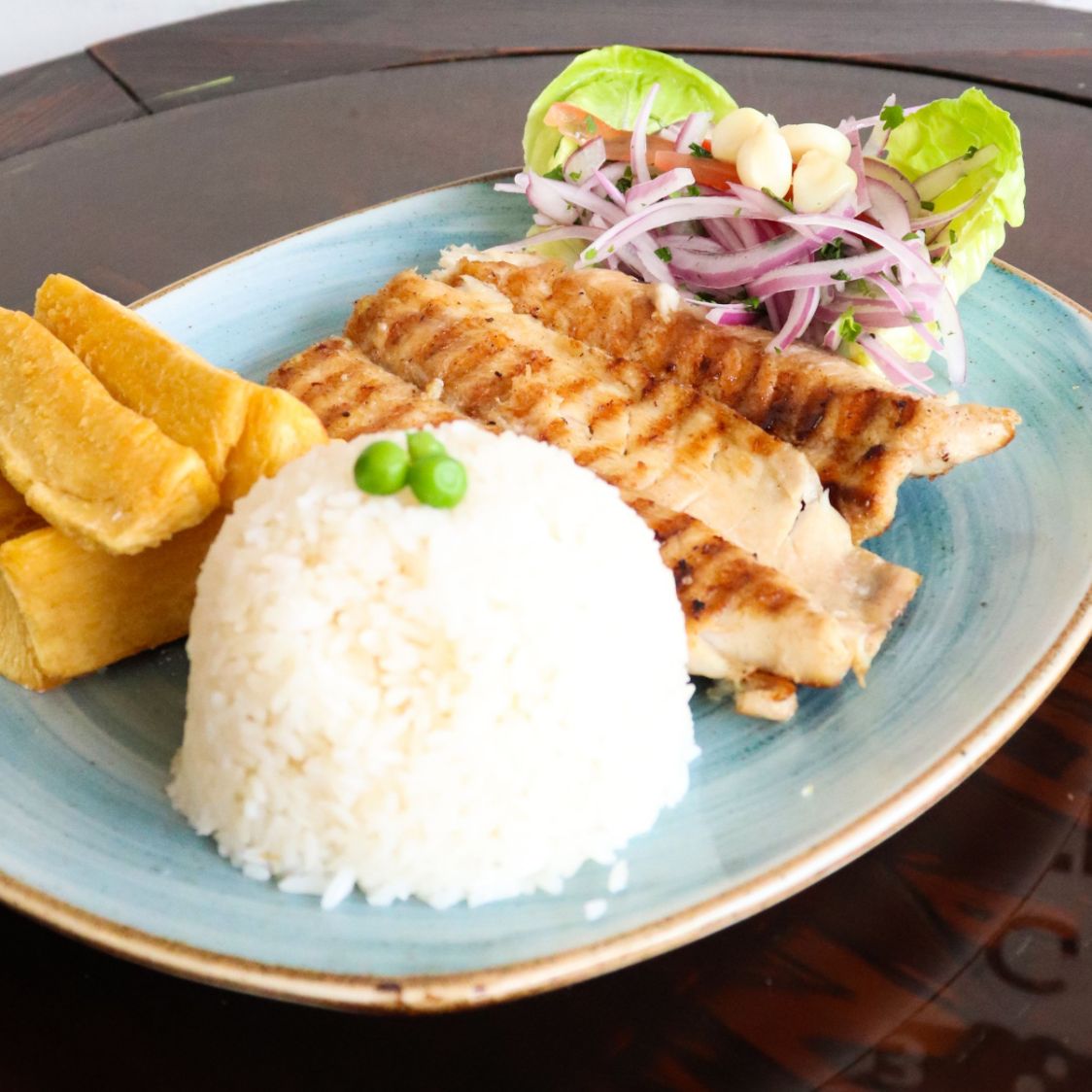 Filete de pescado acompañado de yucas doradas/sancochadas, arroz blanco y ensalada.