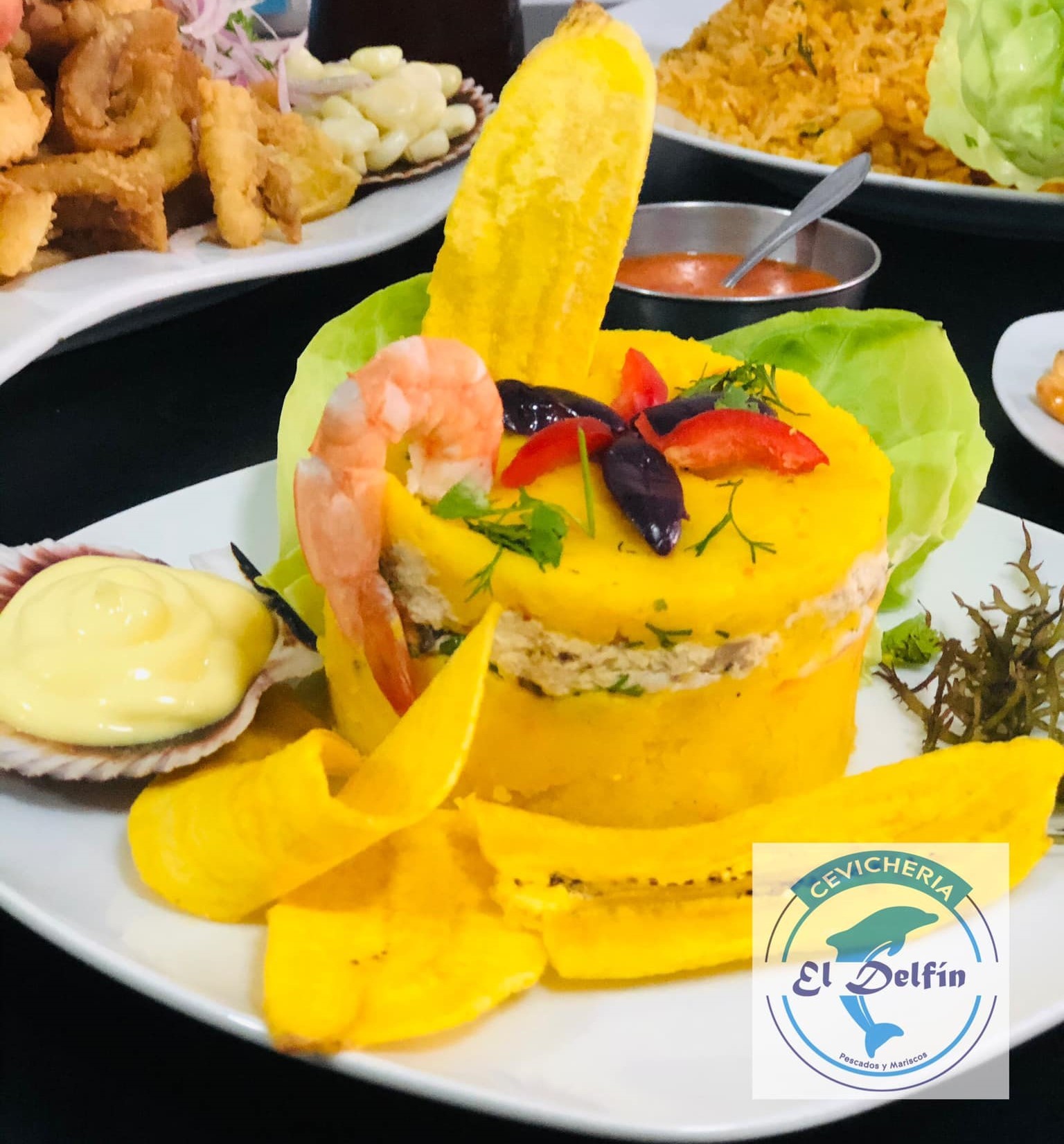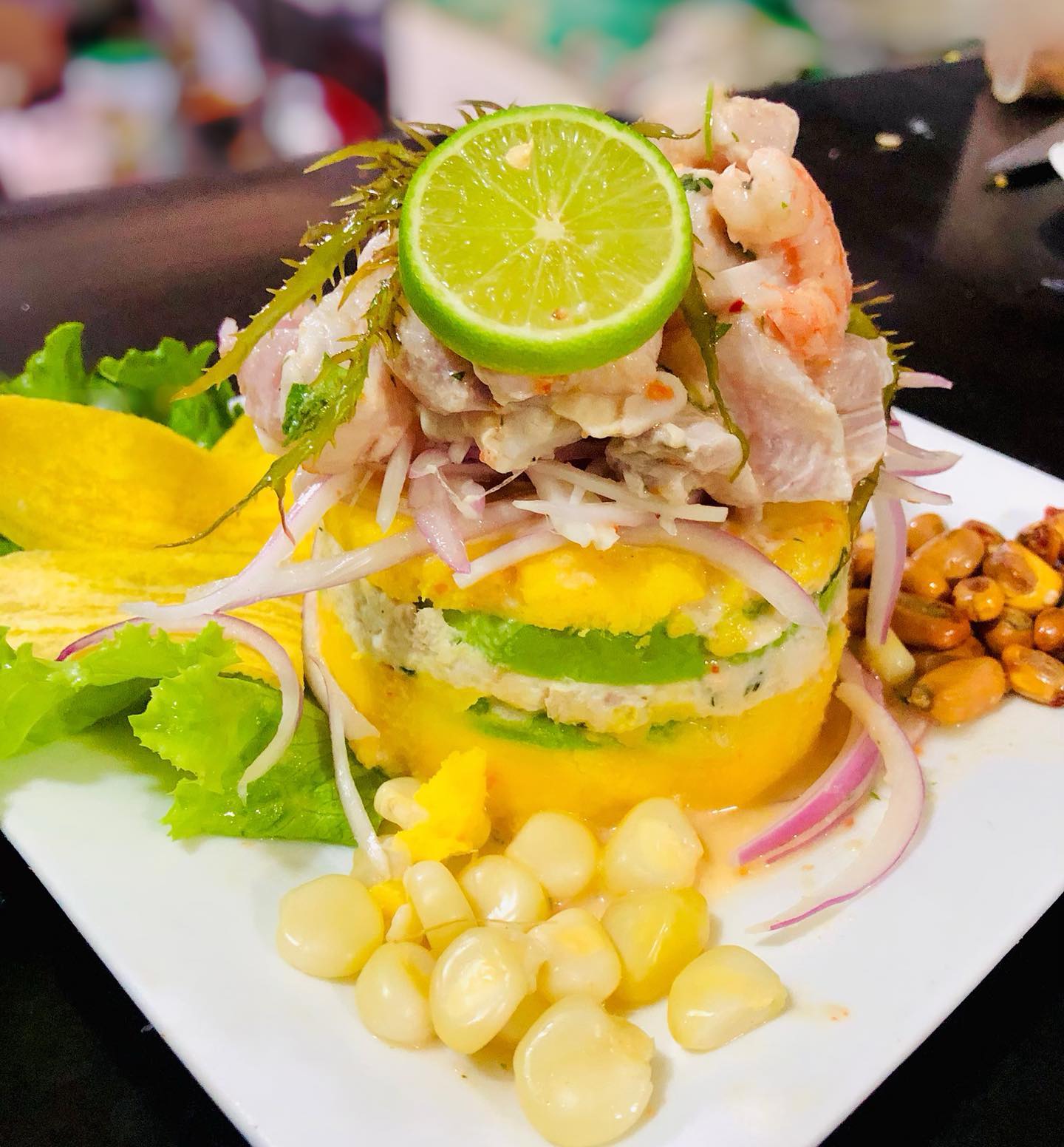 Ceviche a base de frescos mariscos con ensalada criolla de cebolla, yuca frita, cancha, chifle y ají.