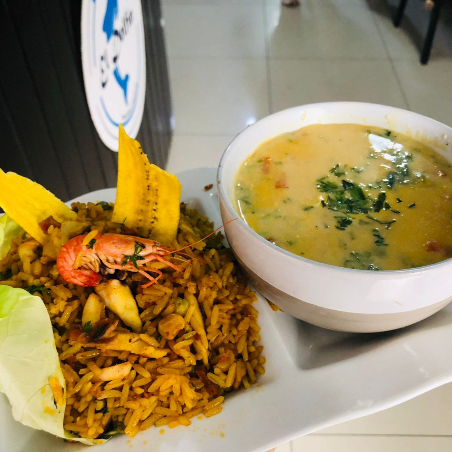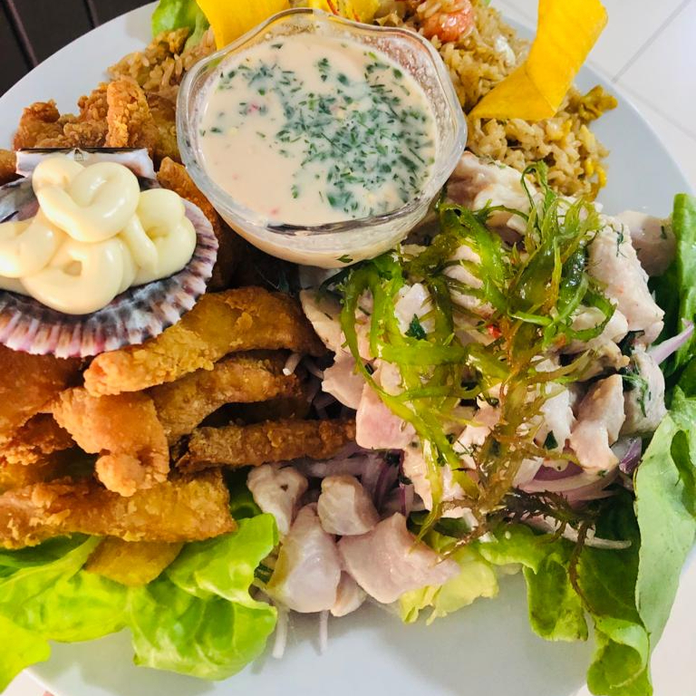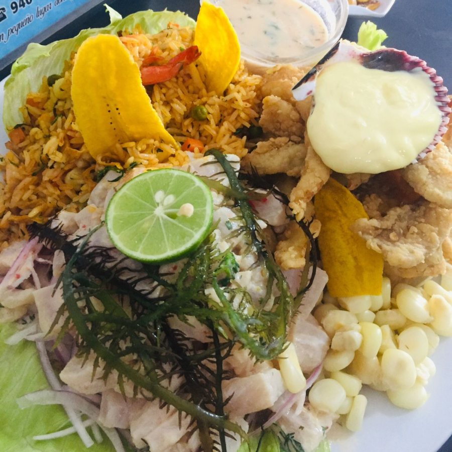 Arroz con mariscos, ceviche de pescado más chicharrón de pescado.