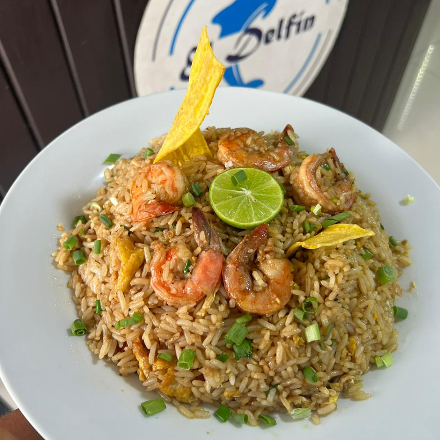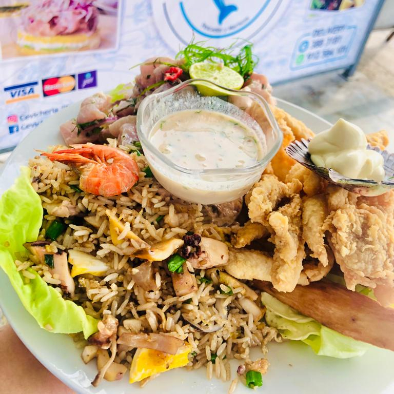 Chaufa de mariscos, ceviche de pescado más chicharrón de pescado.