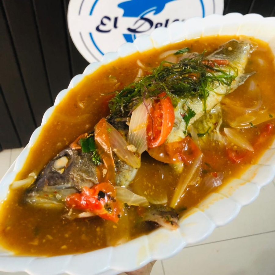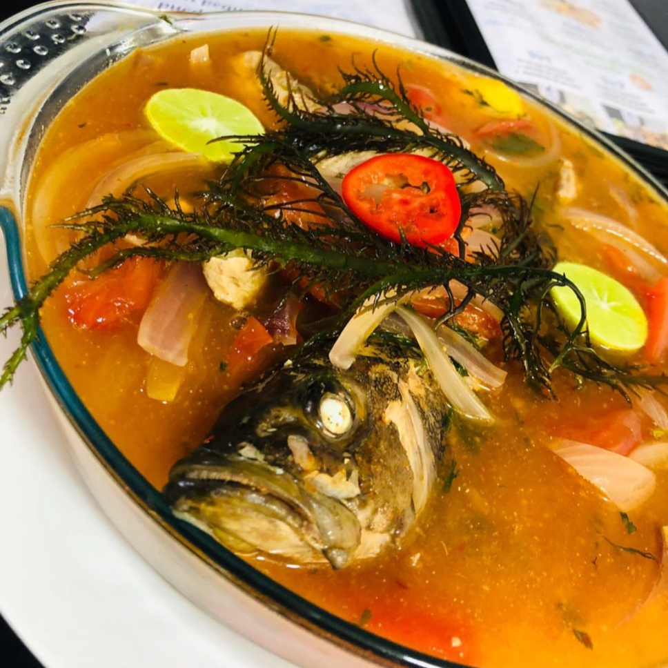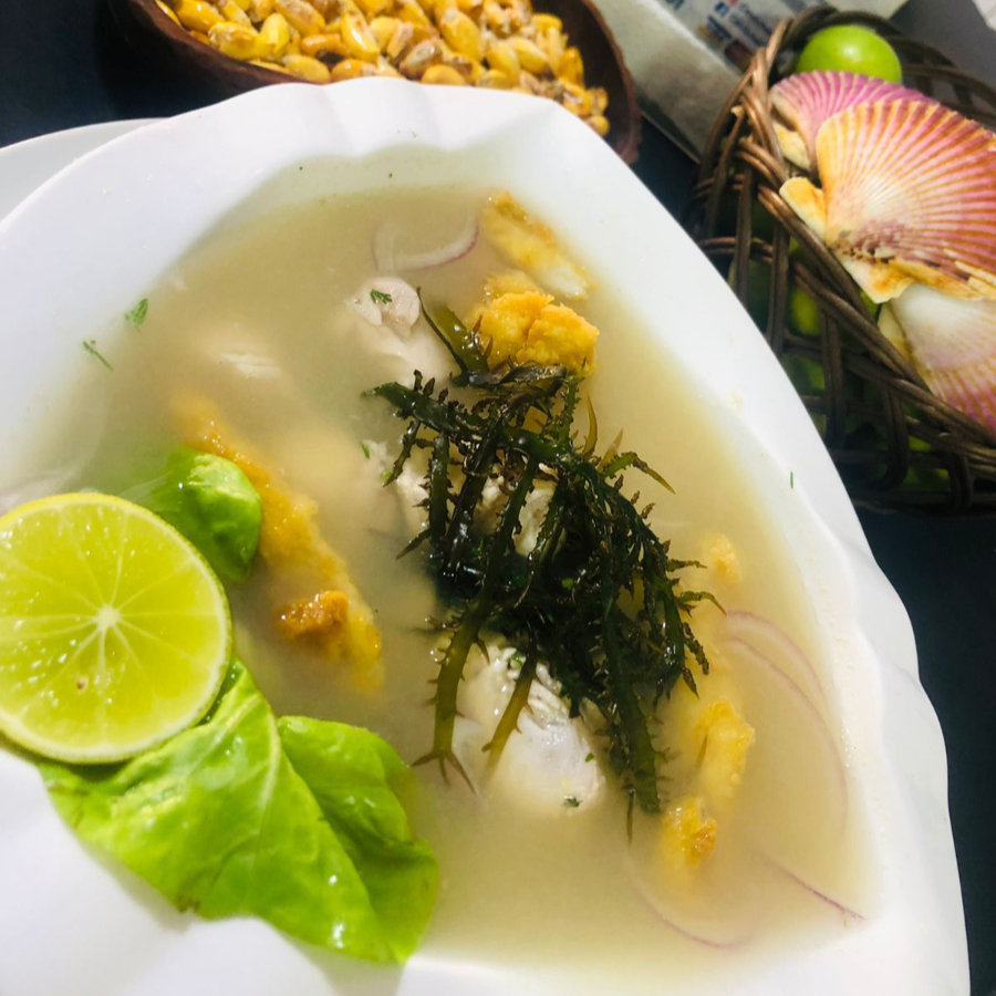 Sopa a base de caldo de concentrado de pescado , al que se agrega condimentos en su punto, con trozos de pescado y un par de chicharrones
