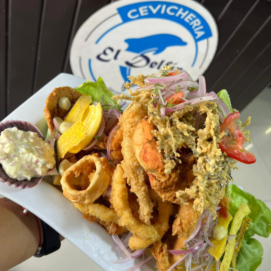 Aros de calamar empanizado con ensalada criolla de cebolla, yuca frita, cancha y chifle.