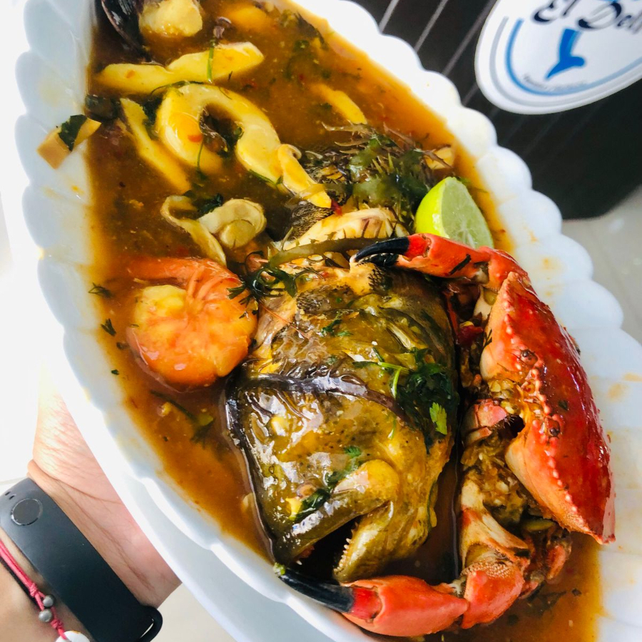 Cangrejo sazonado con sal, pimienta cocido con cebolla, tomate en gajos, salsa madre, fumet de pescado, zapallito loche, chicha de jora, culantro, cebolla china y yuca sancochada, viene acompañado con una porción de arroz.