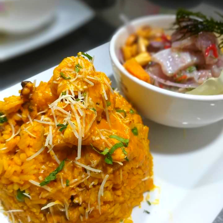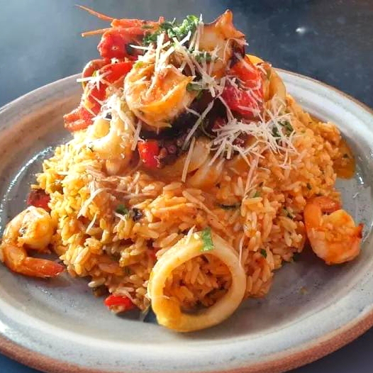 Arroz a base de salsa madre, con mixtura de mariscos y decorado con queso parmesano.