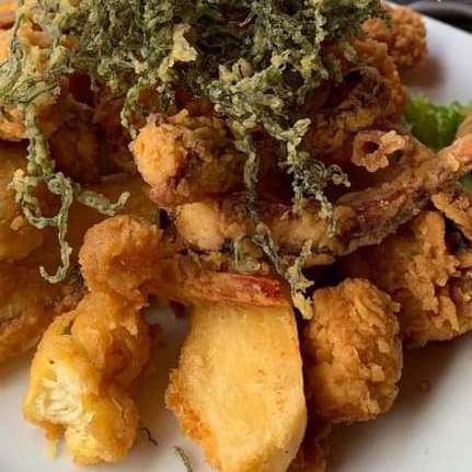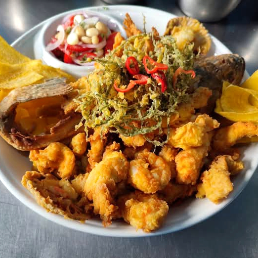 Trozos de pescado y mariscos, empanizados y fritos, acompañado de yuca frita, yuyo frito y guarnición.