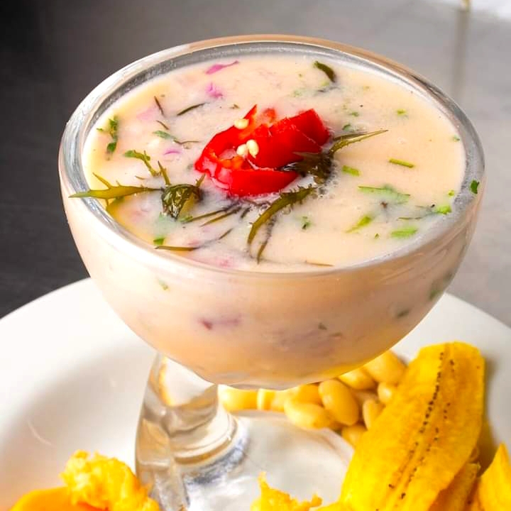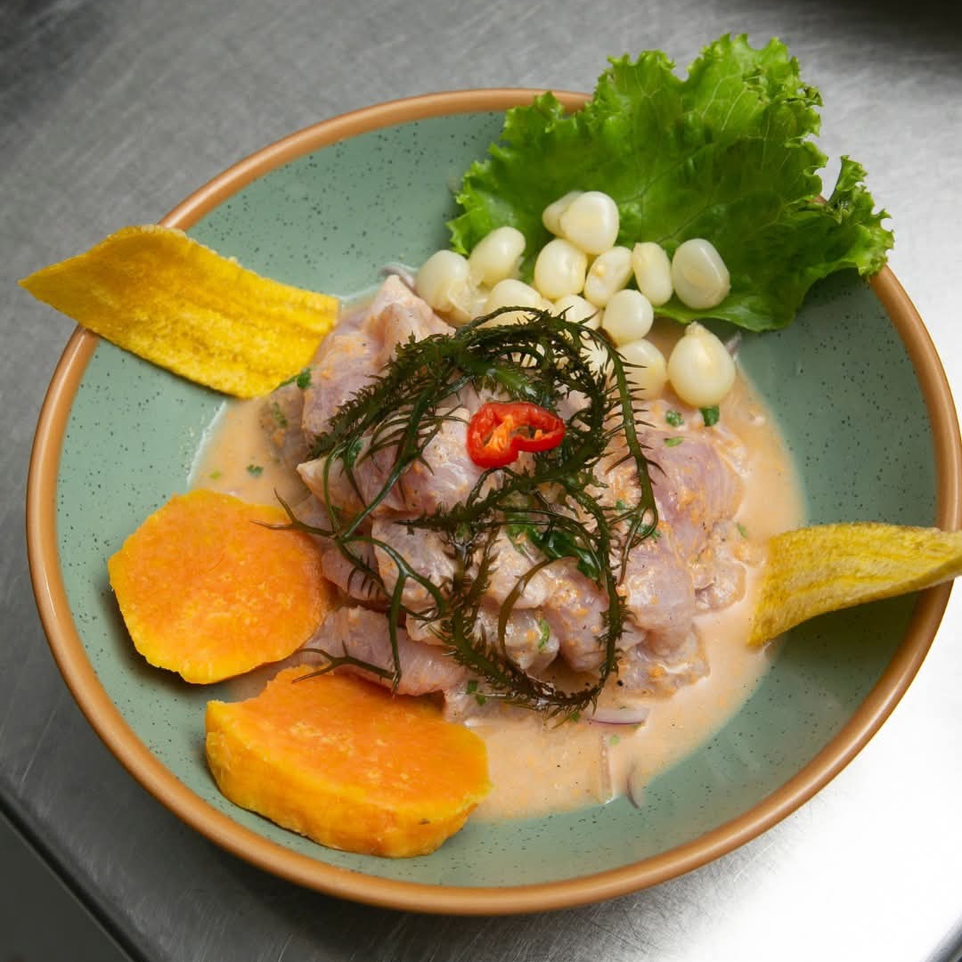 Con trozos de pescado, ají, limón y base cevichera. Acompañado de camote, cancha