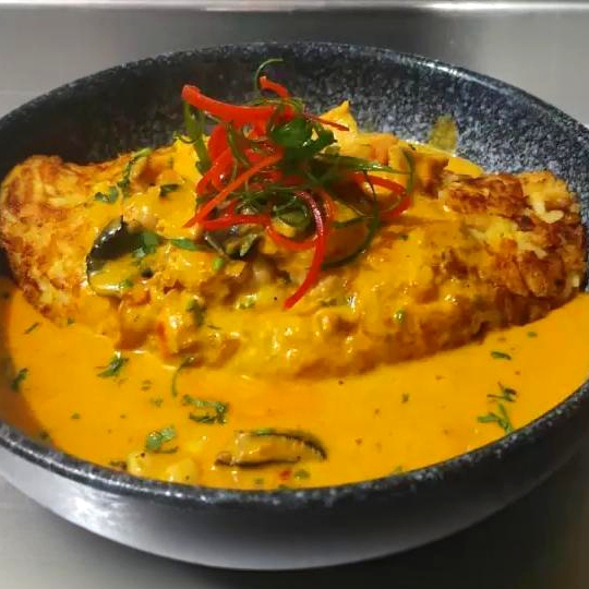 Filete de pescado, mixtura de mariscos, concha abanico y cangrejo