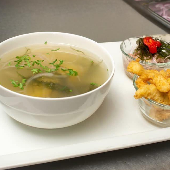 Caldo concentrado con filete de pescado, acompañado de camote, cevichito y chicharrón de pota encima.