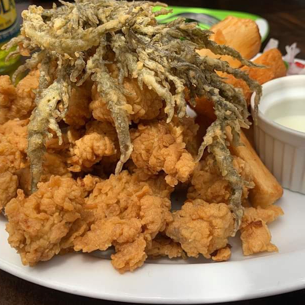 Tiras de pota empanizados y fritos, acompañado de yuca frito, yuyo frito y guarnición.