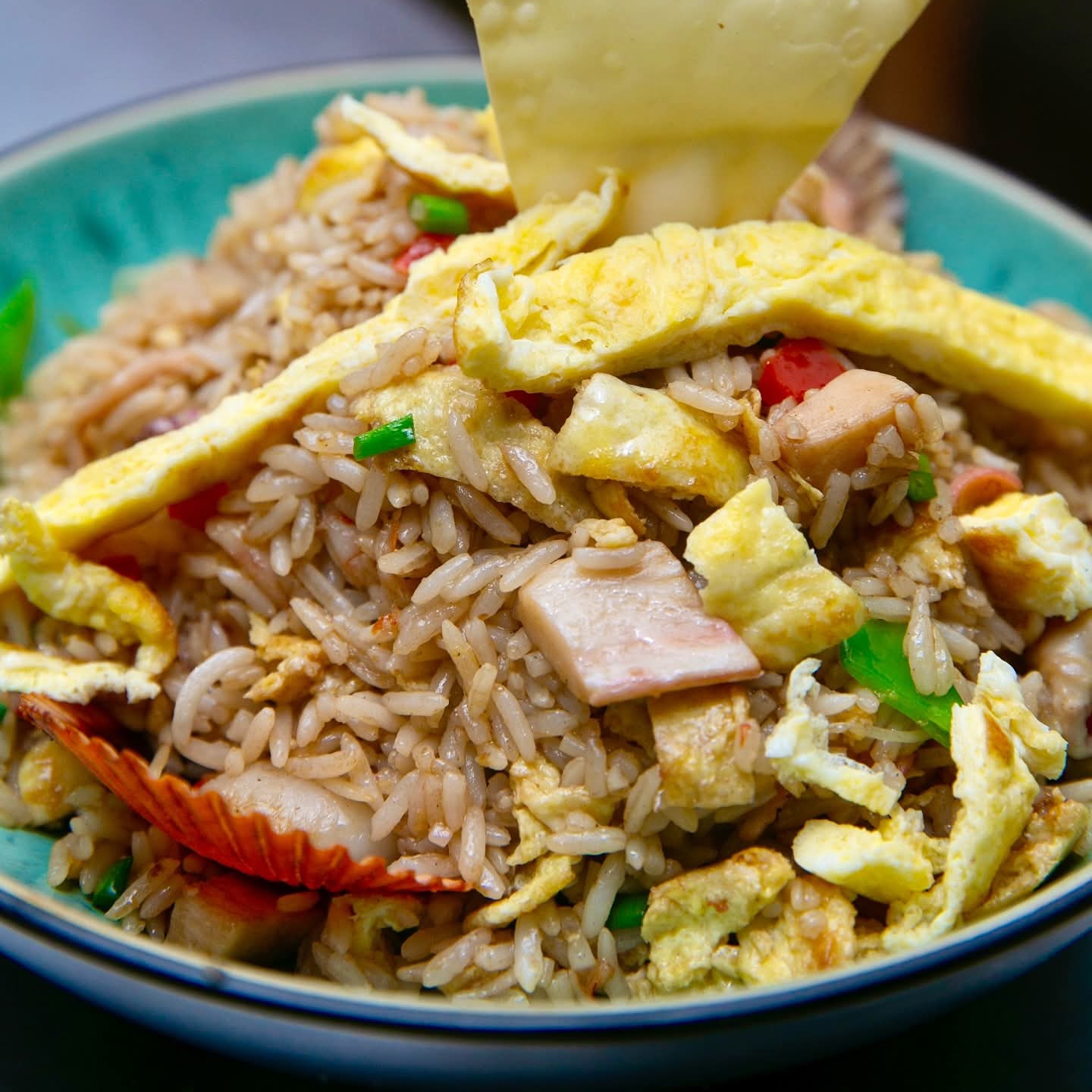 Arroz con salsa de soya, aceite de ajonjolí, kion, cebolla china y mixtura de mariscos salteados al wok.