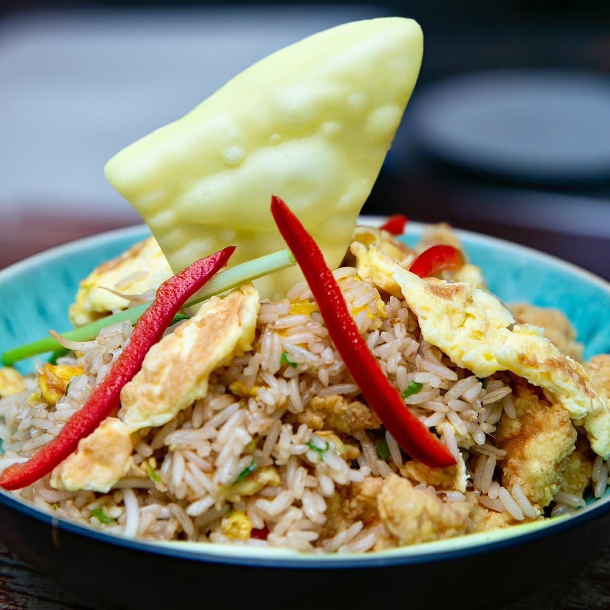 Arroz con salsa de soya, aceite de ajonjolí, kion, cebolla china y trozos de pescado salteados al wok.