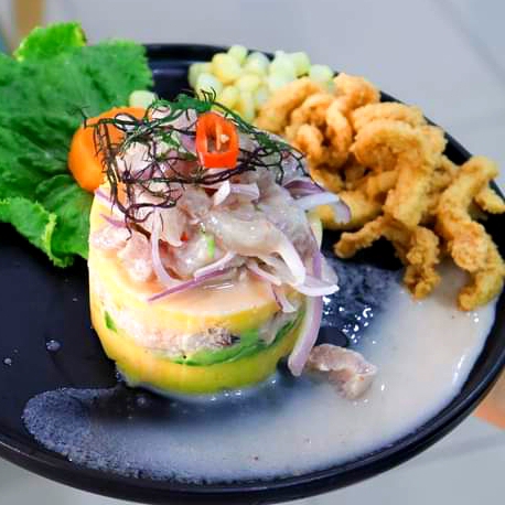 Causa rellena de palta y coronado con ceviche de pescado, acompañado con chicharrón de pota, choclo y cancha.