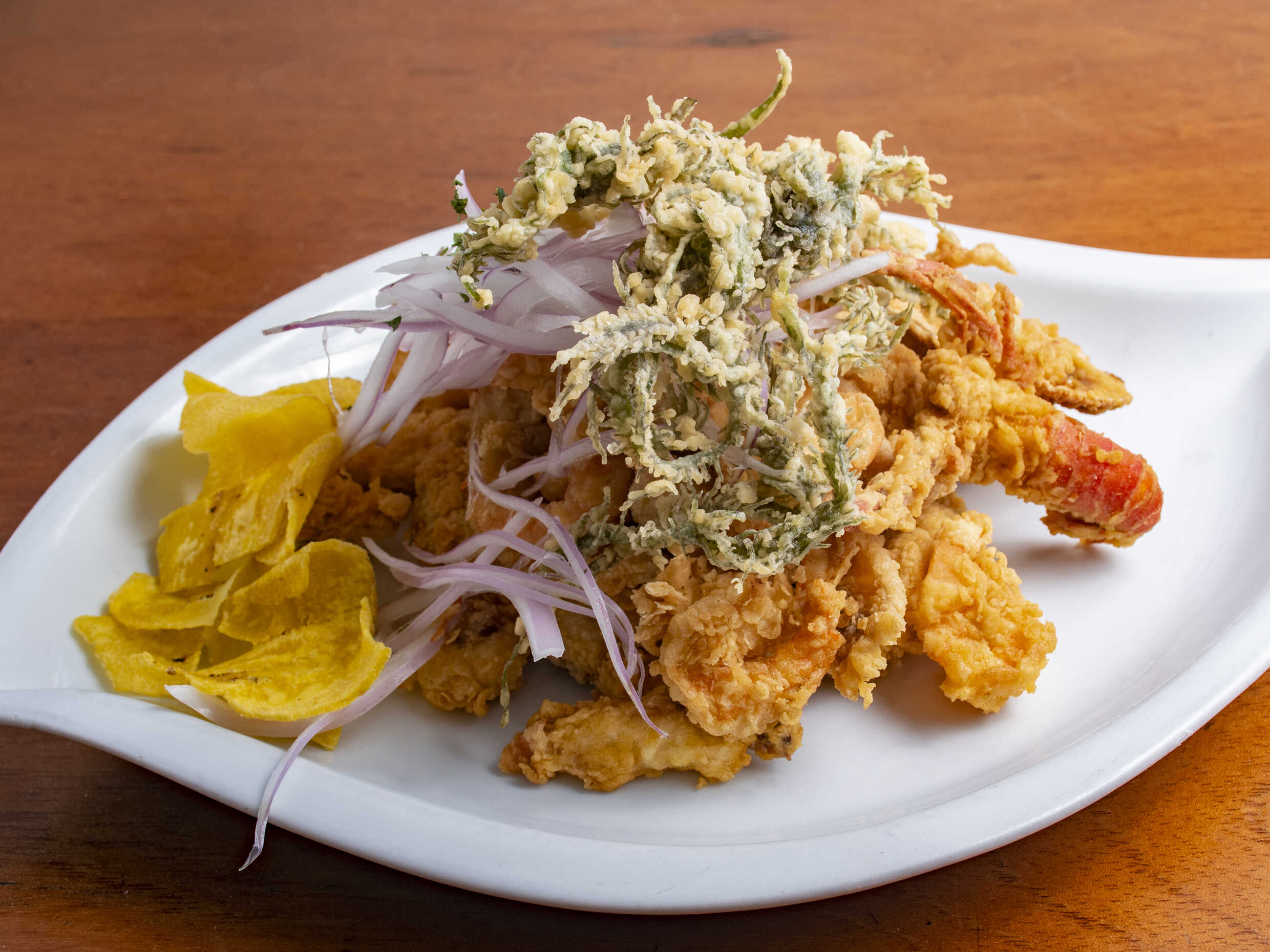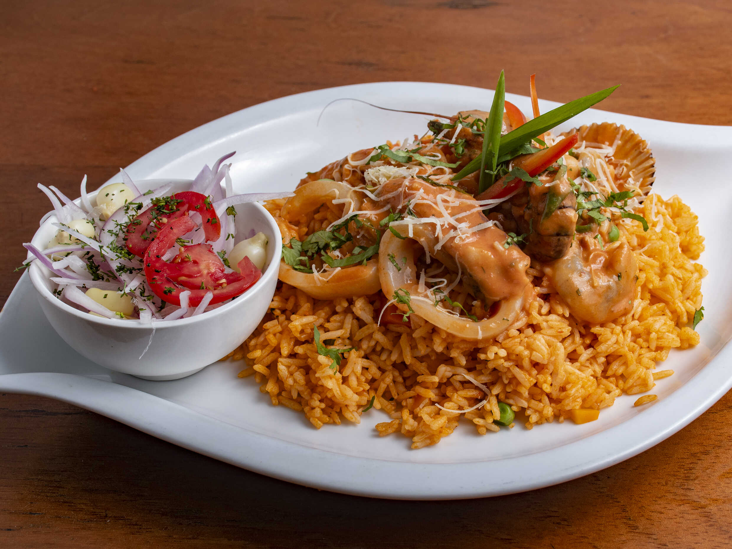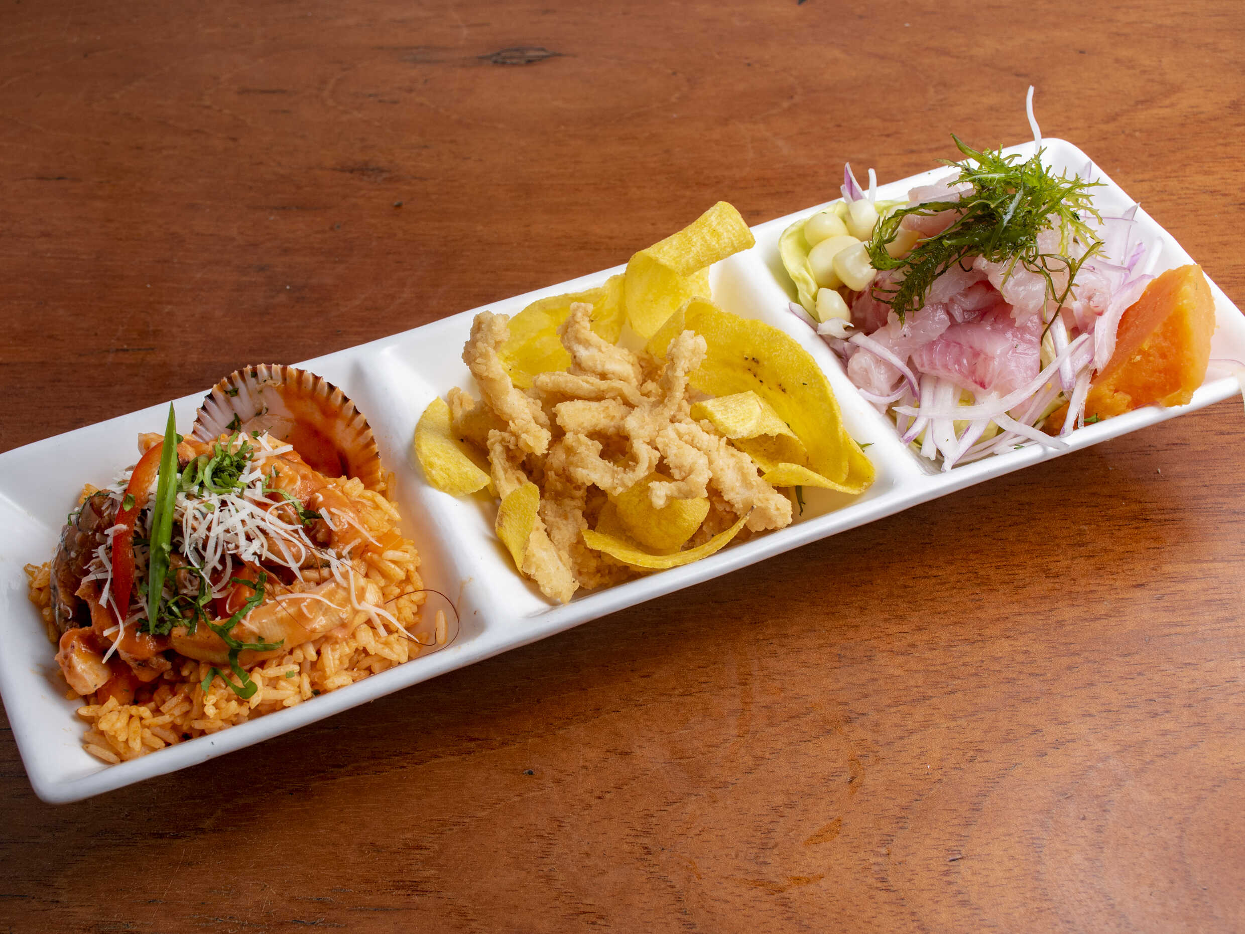 Ceviche + Chicharron de pota + Arroz con mariscos en presentacion personal de 1/2 litro