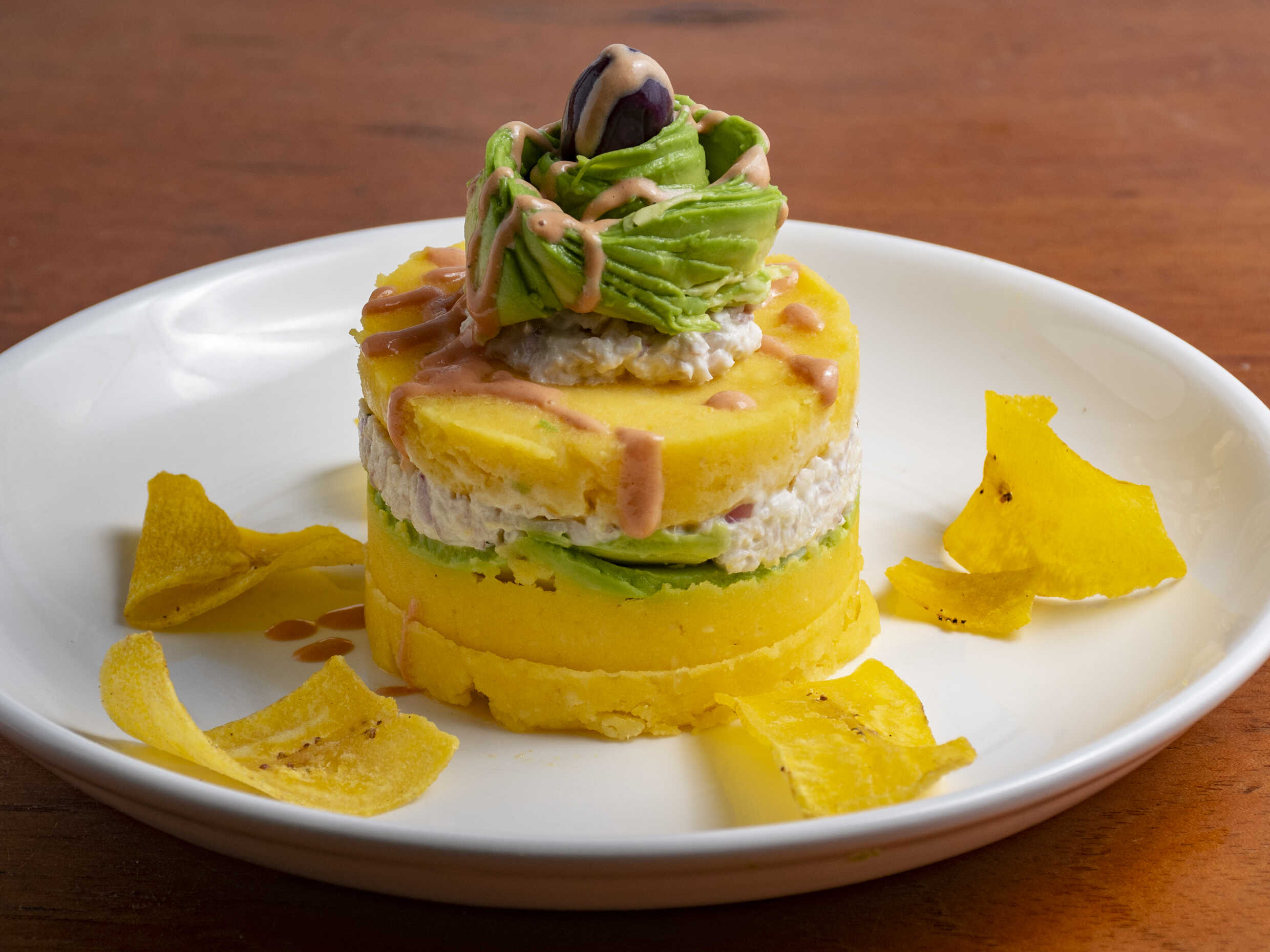 Papa amarilla rellena de láminas de palta, cubierto con ceviche de pescado en salsa de ají amarillo.