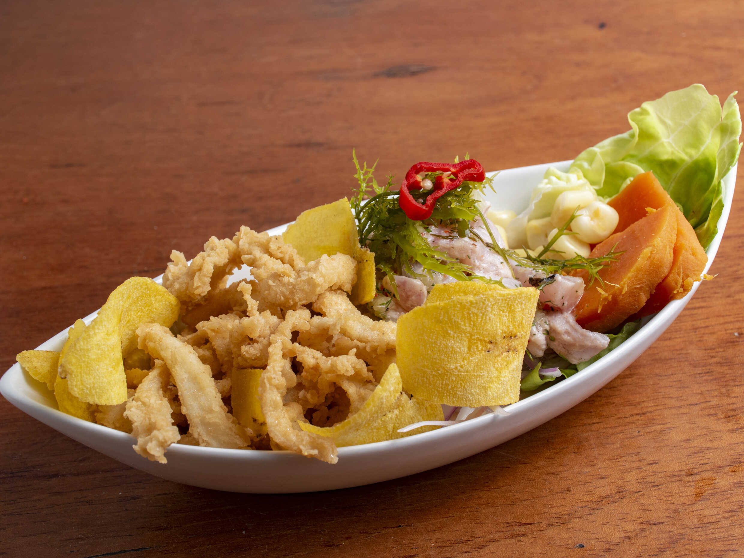 Mas cantidad de Trozos de pescado del día en pasta de ají, jugo de limón, acompañado de cebolla en láminas, lechuga, camote y choclo.