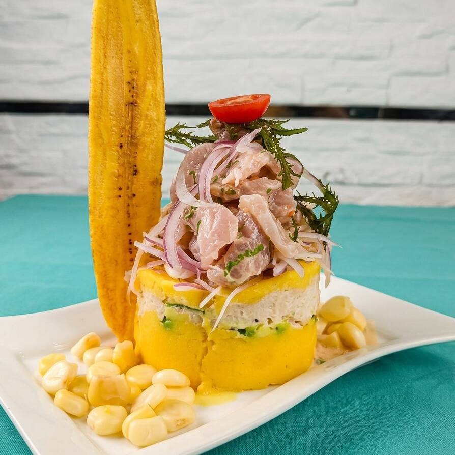 Causa rellena de pescado, acompañado de ceviche.Incluye aguadito de pescado gratis( sujeto a stock).