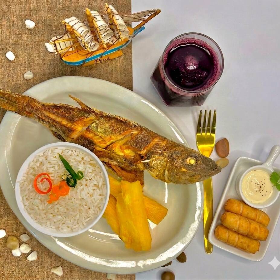 Cabrilla frita acompañado de yuca frita, arroz y zarza criolla. incluye aguadito de pescado gratis(sujeto a stock).