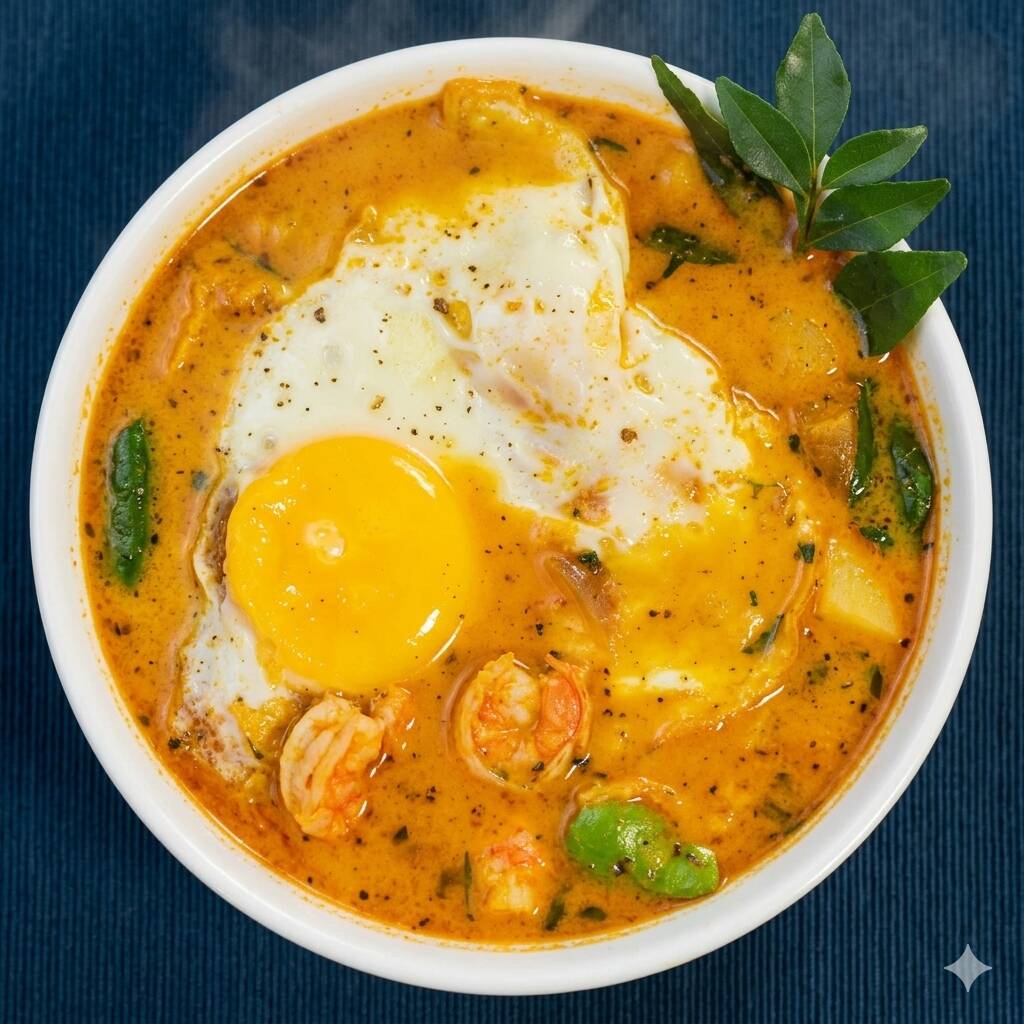 Chupe con langostinos, maíz, zanahoria, orégano y huevo.