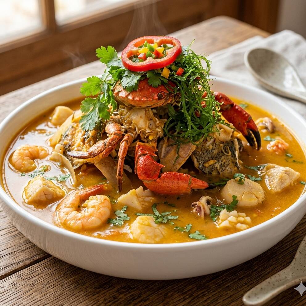 Plato a base concentrado de pescado blanco, acompañado de un mix de mariscos, langostinos, calamares, pescado de tramboyo, yuca.