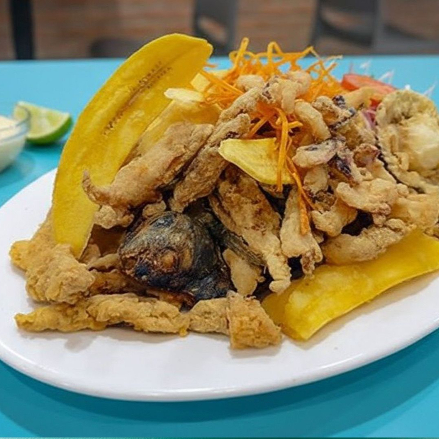 Chicharrón de pescado acompañado de mixtura de mariscos(langostino, calamar,pota, pulpo, concha de abanico) y zarza criolla. Incluye aguadito de pescado gratis( sujeto a stock).