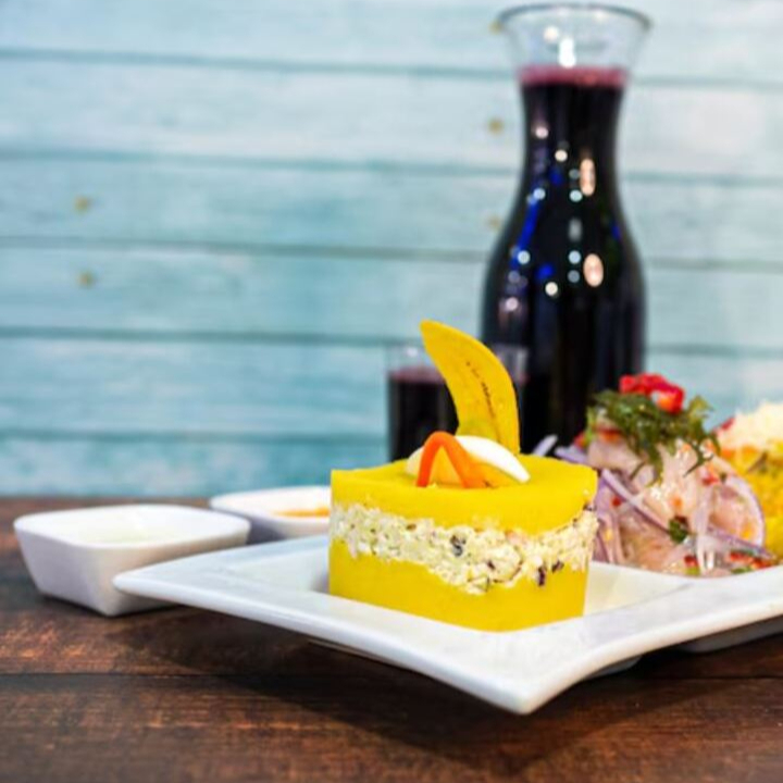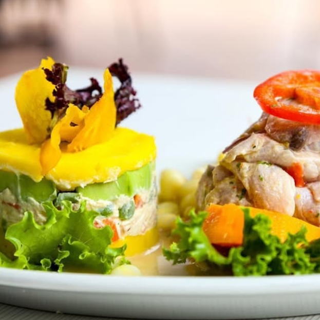 Causa cremosa de pollo acompañada del potente ceviche mixto.