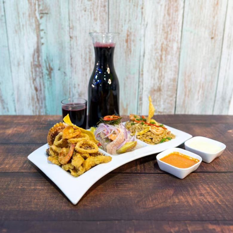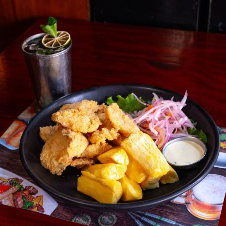 Crujiente combinación de pescado, pota y mariscos fritos servidos con yuca, sarza criolla y limón fresco.