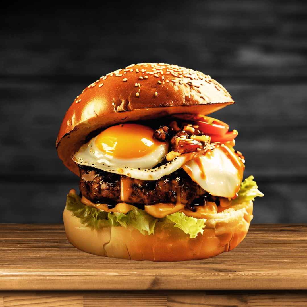 Más de 200gr de hamburguesa artesanal con doble queso, tocinos, huevo, cebolla caramelizada, lechuga hidropónica servida en pan brioche artesanal y salsas a elección.