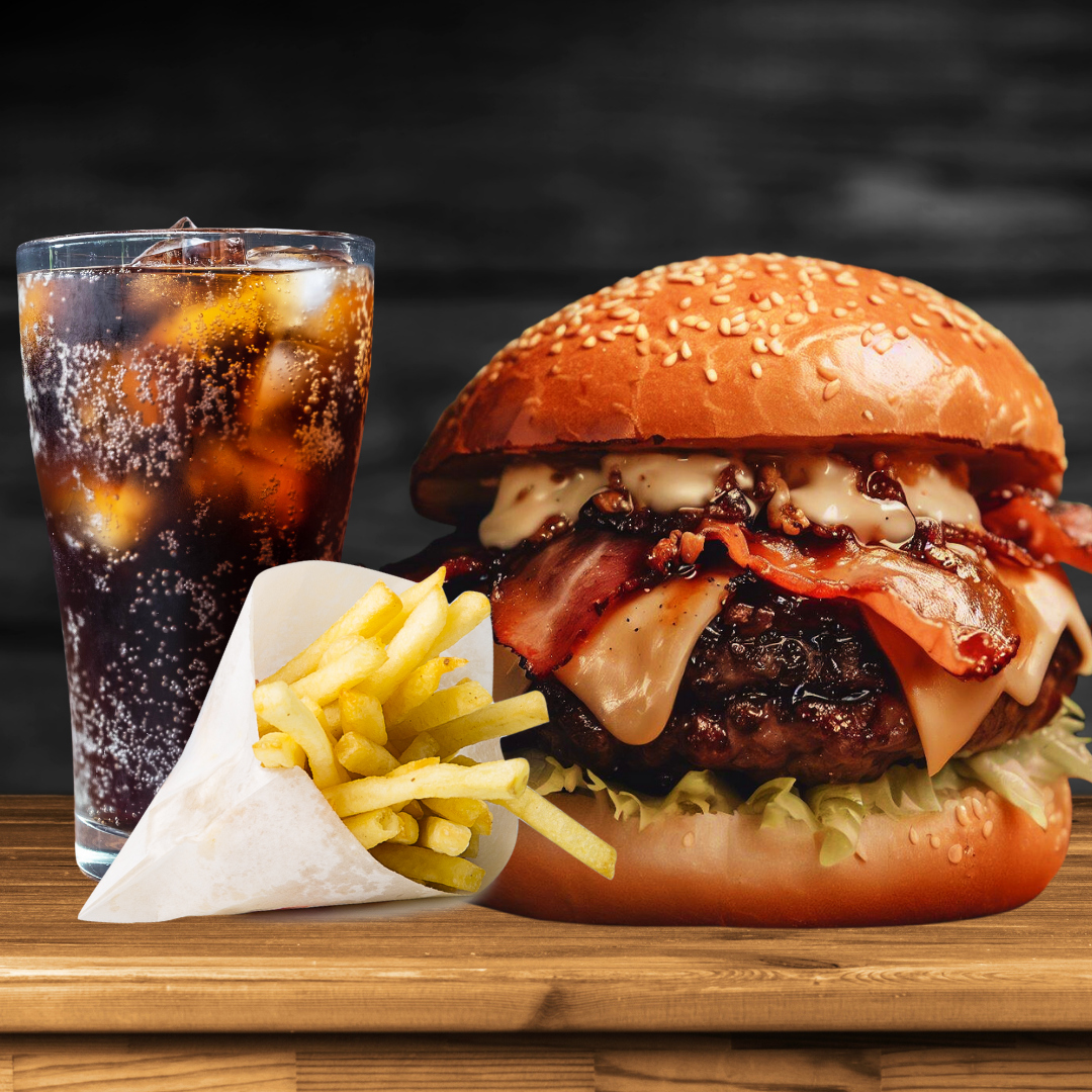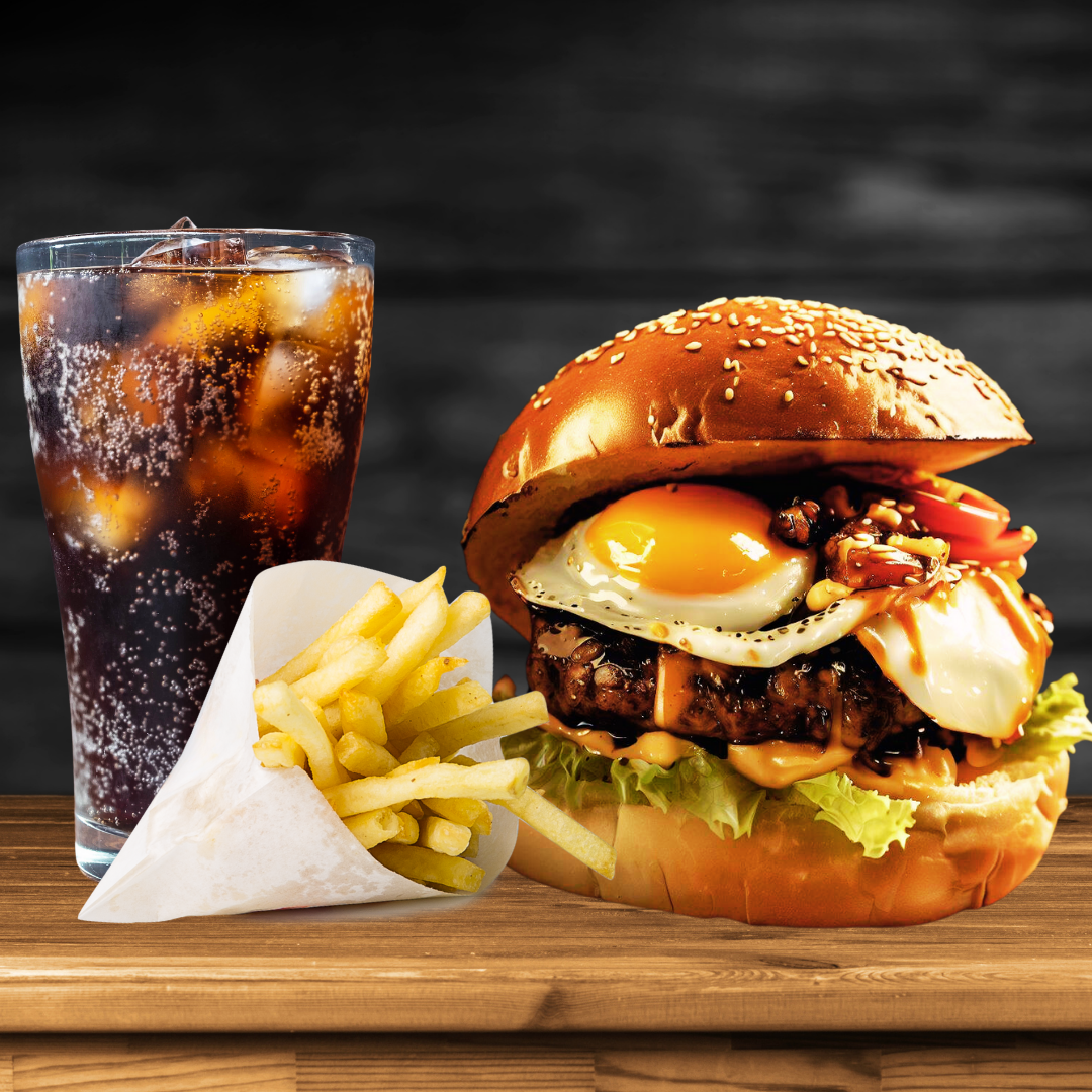 Burger artesanal (más de 200gr) con tocino, huevo, quesos derretidos, cebolla caramelizada, lechuga hidropónica servida en pan artesanal acompañada de nuestras ricas y exclusivas papas fritas.