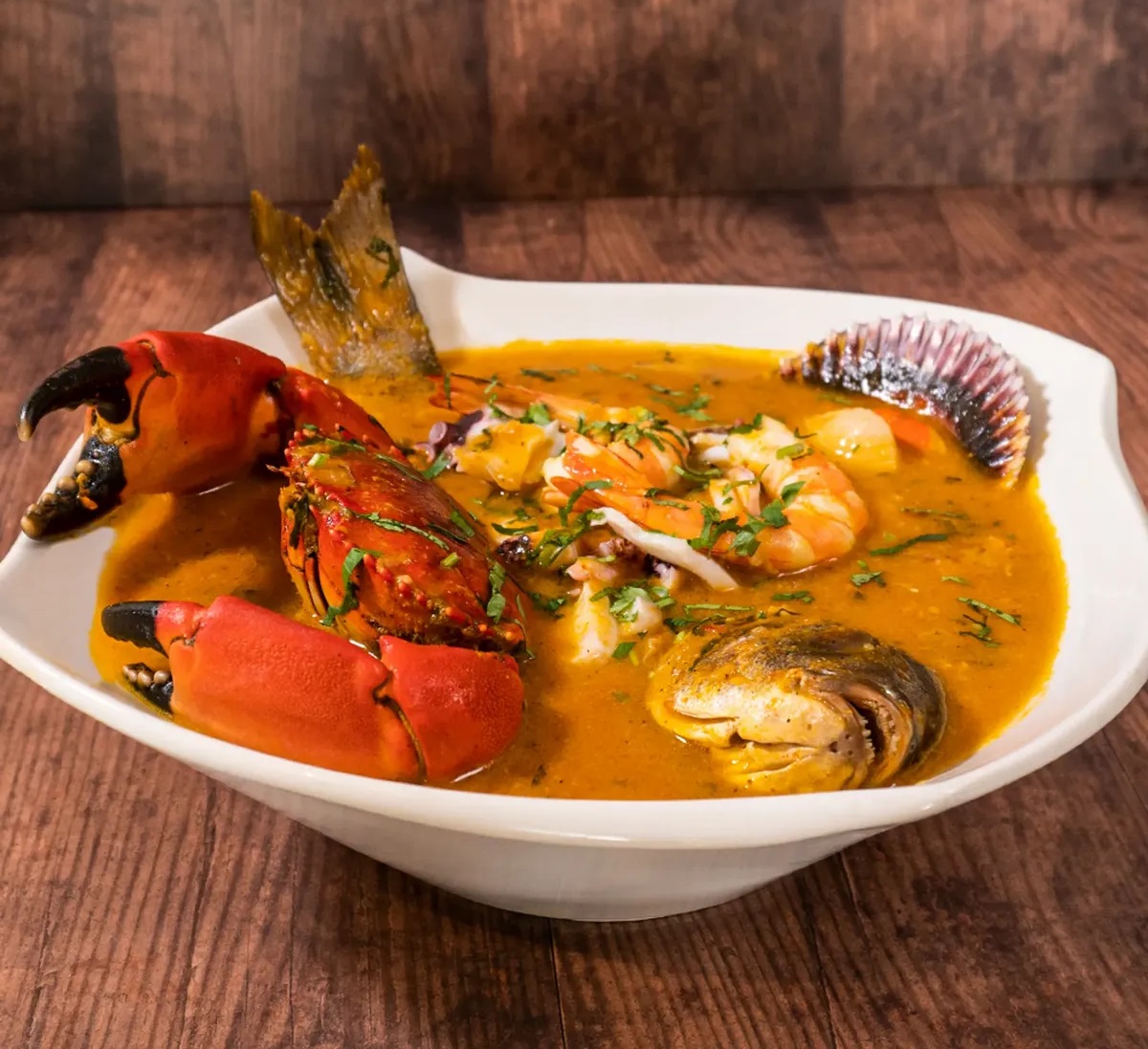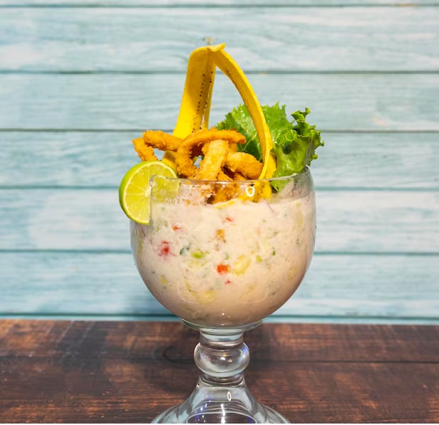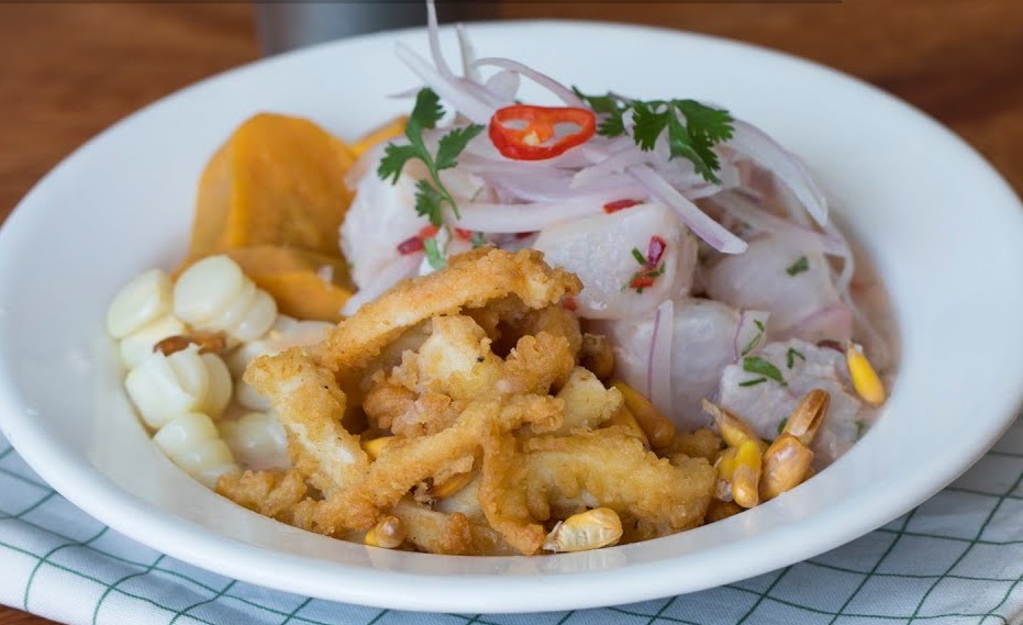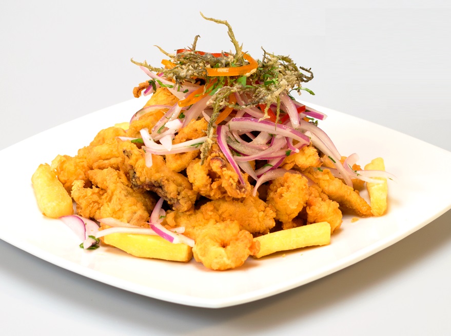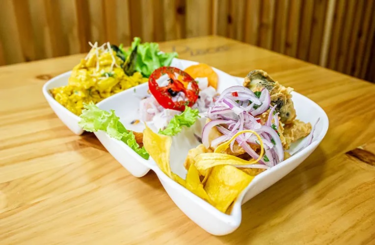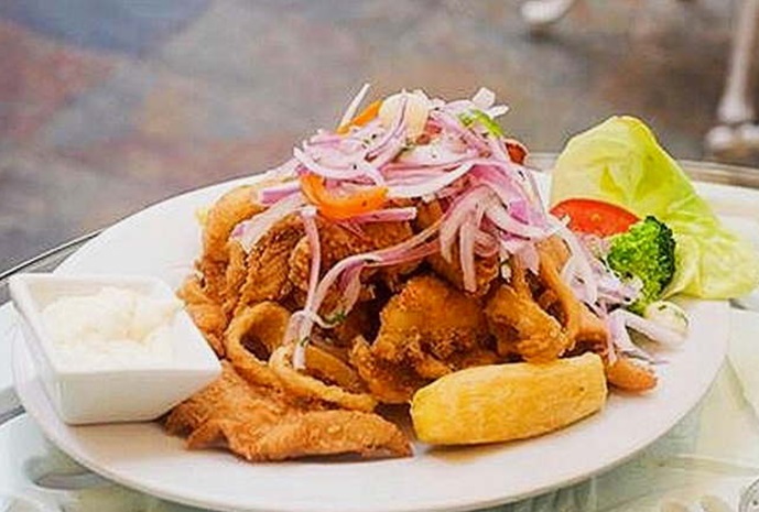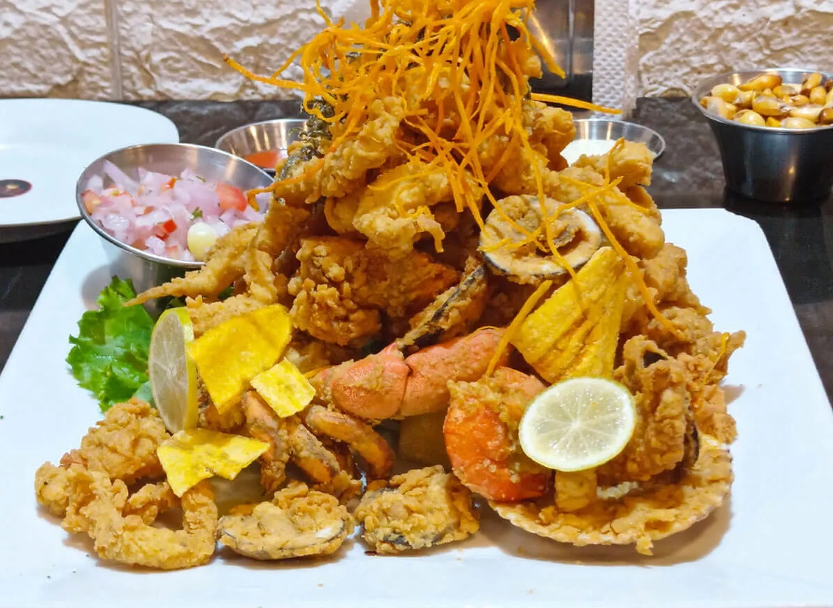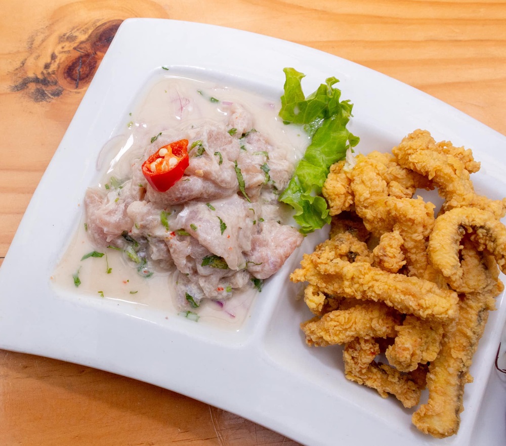 Trozos de pescado, mixtura de mariscos, yuca, tártara y criolla.