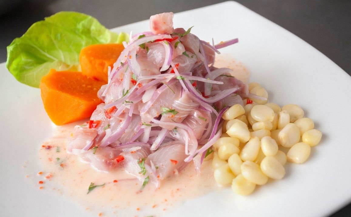 Pescado en láminas bañada en jugo de ceviche.