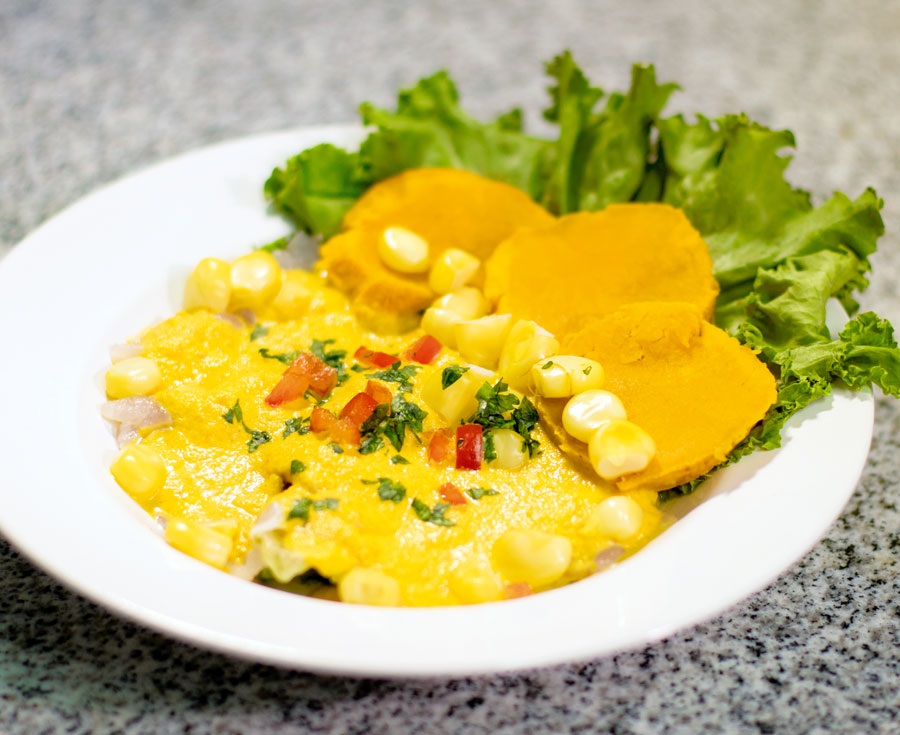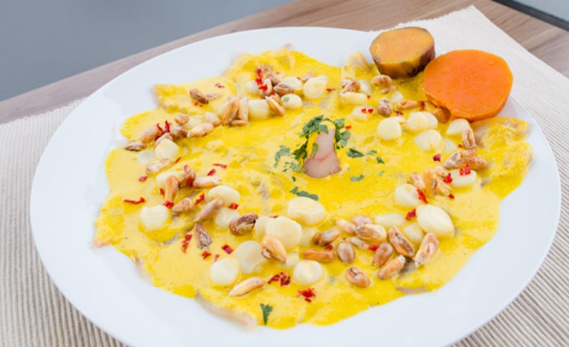 Pescado, mixtura de mariscos, choclo, camote glaseado y canchita.