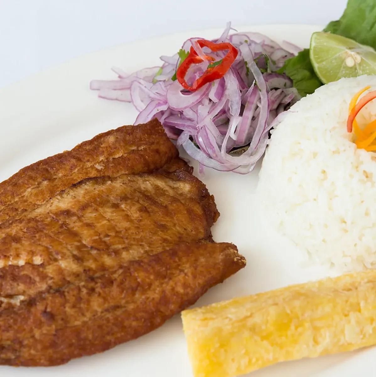Pesca del día, más arroz, yuca y criolla.
