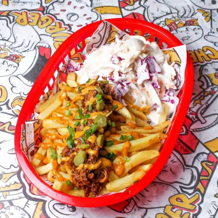 Papas fritas con tiras de pechuga de pollo crispy, cole slaw, pickles, salsa cheat y cebolla china.
