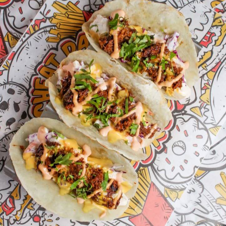3 Unidades de tortilla de trigo, cheat day pulled pork, queso cheddar, cole slaw, queso fundido y cilantro.