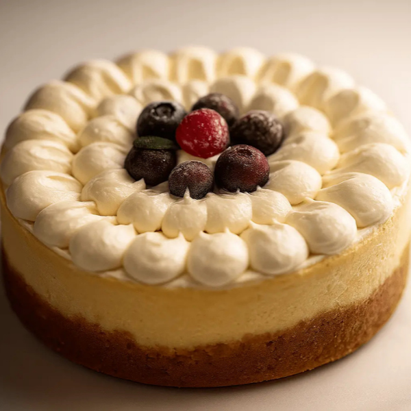 El clásico cheesecake original de puro queso crema horneado sobre base de galleta, cubierto con topping de sour cream y decorado con cereza al marrasquino. Molde de 13 cm, 4 porciones.