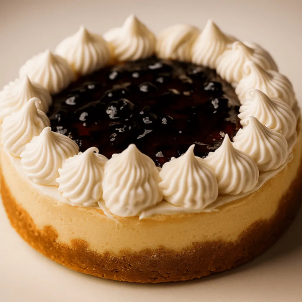 Deleita tu paladar con nuestro irresistible cheesecake horneado con puro queso crema, mermelada casera de sáuco y crema batida (8 onzas)