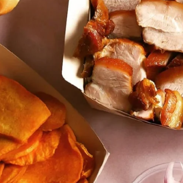 Chicharrón 1 kg, camote frito, sarza criolla y cremas de la casa.