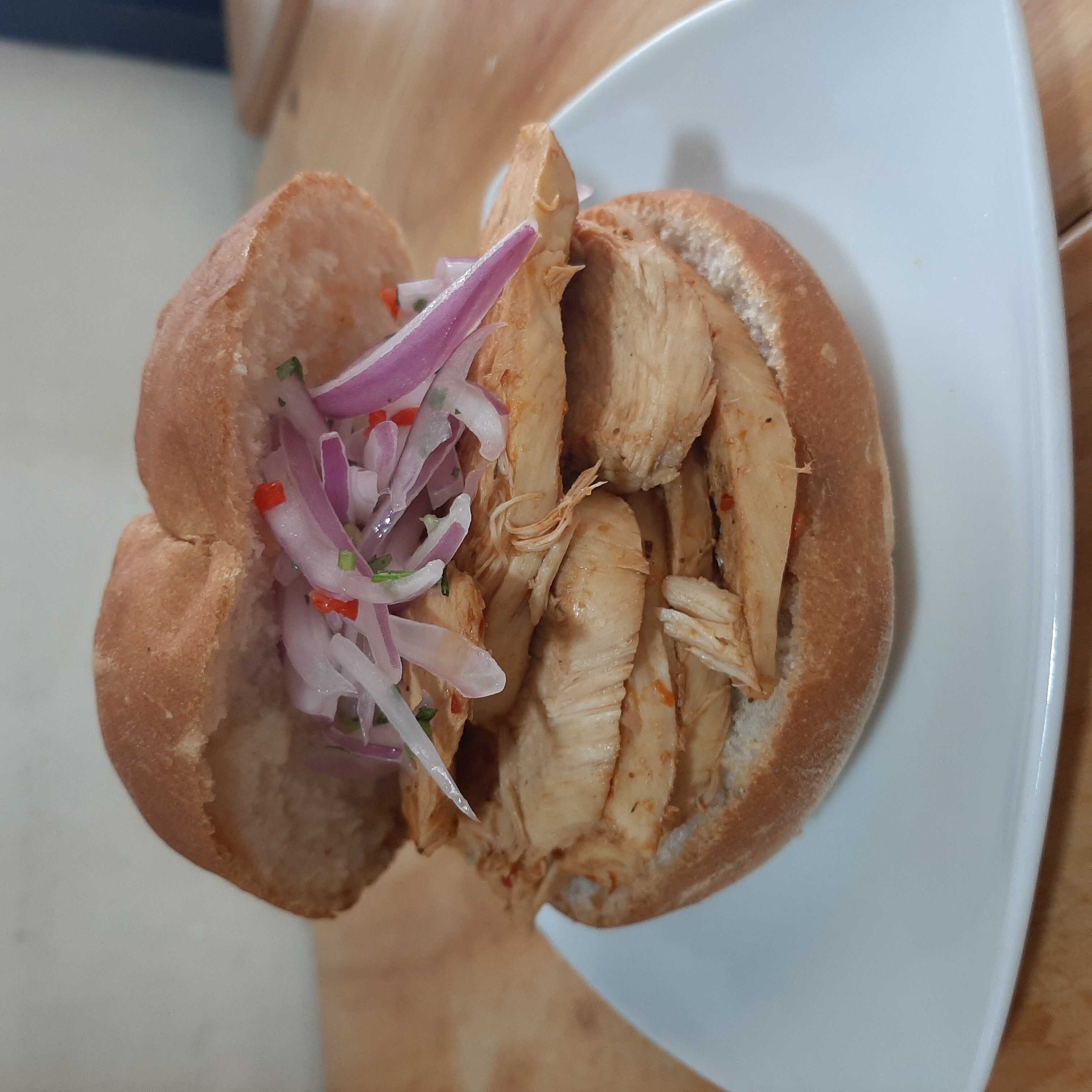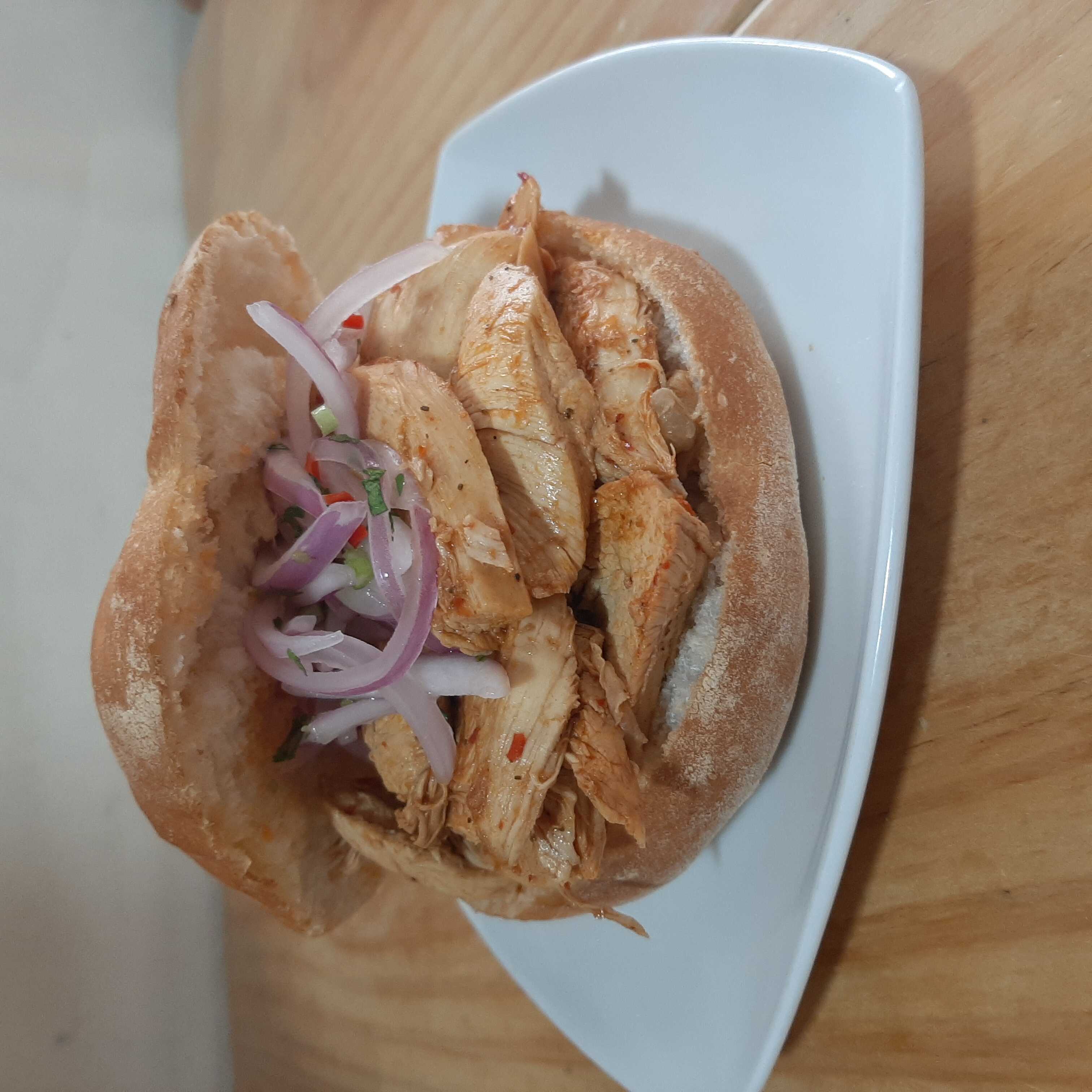 Sánguche de pollo asado oriental acompañado con sarsa criolla o nabo encurtido según tu elección.