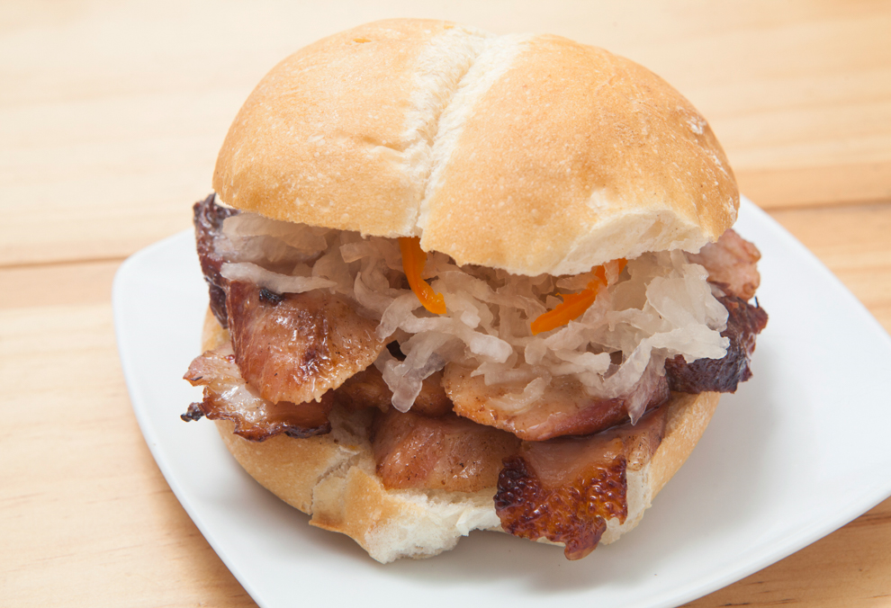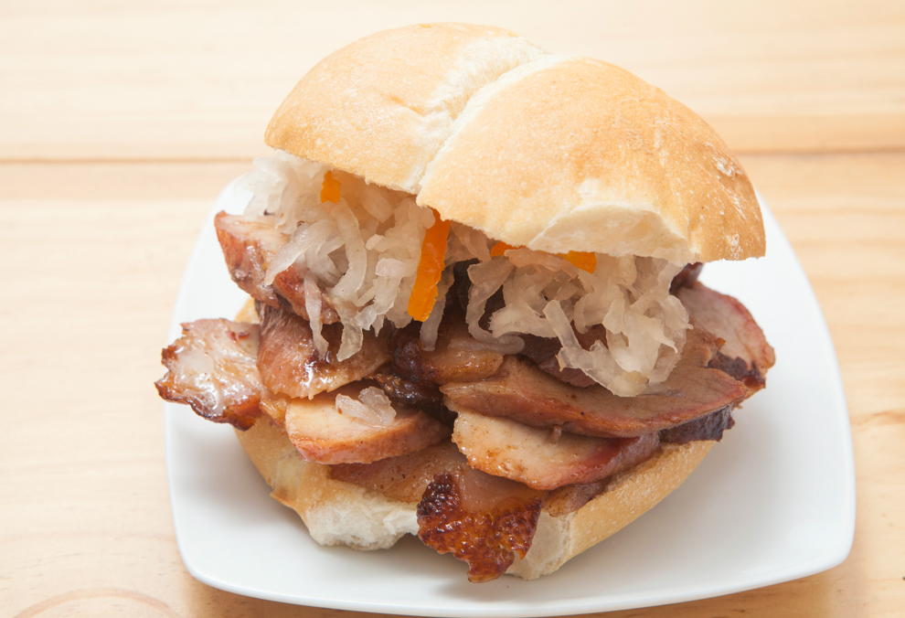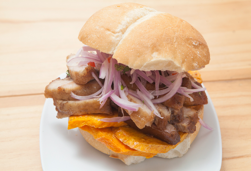 Sánguche de chanchito asado oriental acompañado de sarsa criolla o nabo encurtido según tu elección.