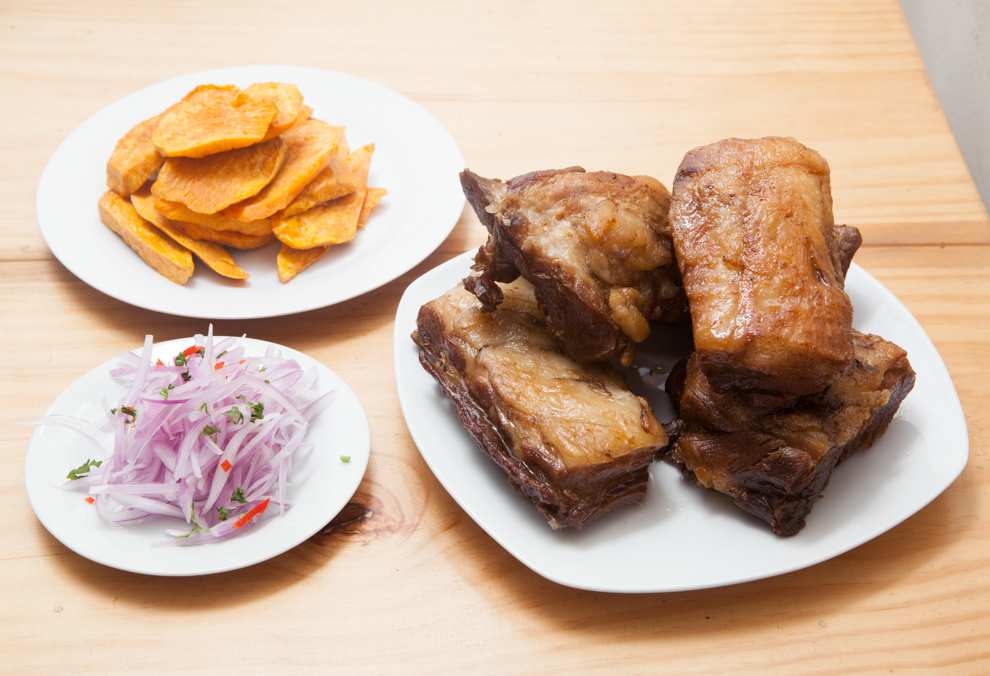 3/4 Kg Chicharrón criollo, camote y sarsa criolla.