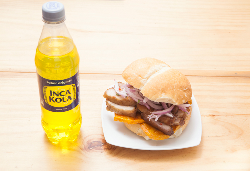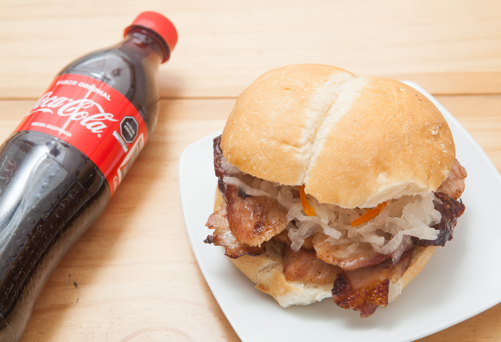Sánguche de lomo de chancho asado oriental, acompañado de sarsa criolla o nabo encurtido según elección, gaseosa de 500 ml.