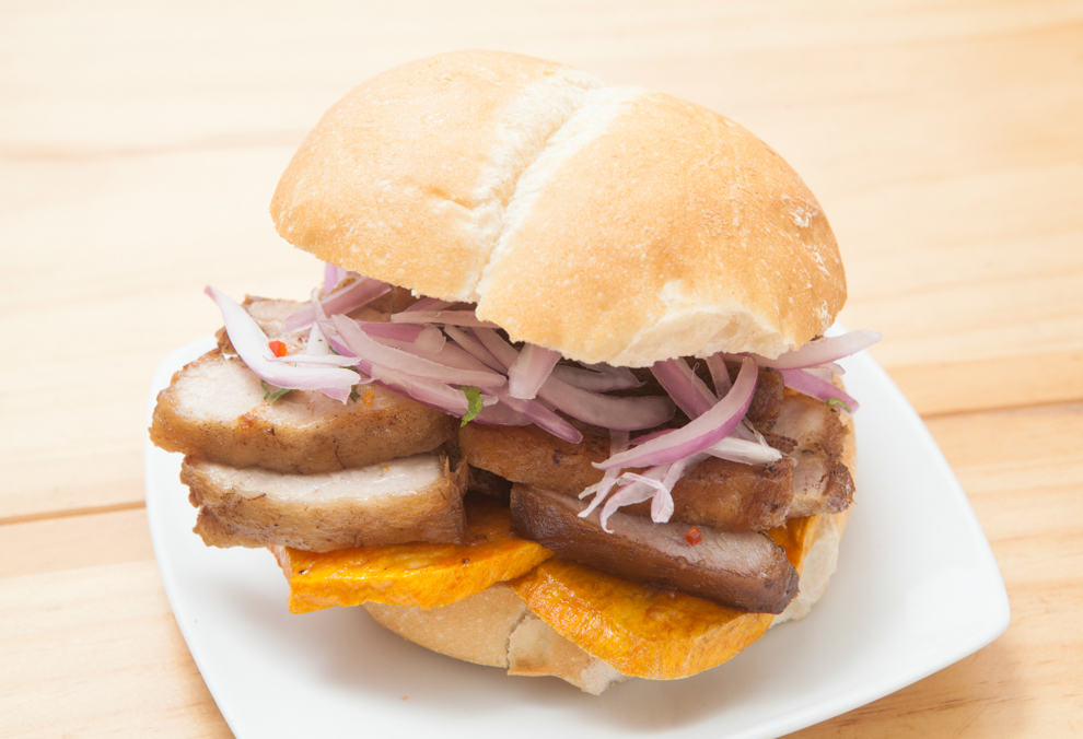 Sánguche chancho asado oriental, acompañado de sarsa criolla o nabo encurtido según tu elección, porción de camote y bebida a elección de 500 ml.