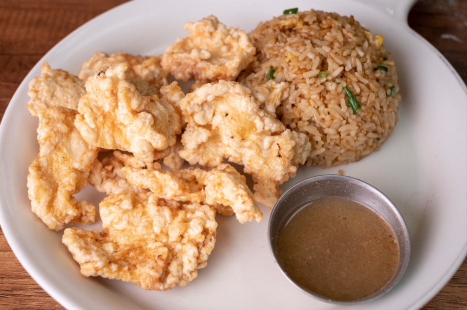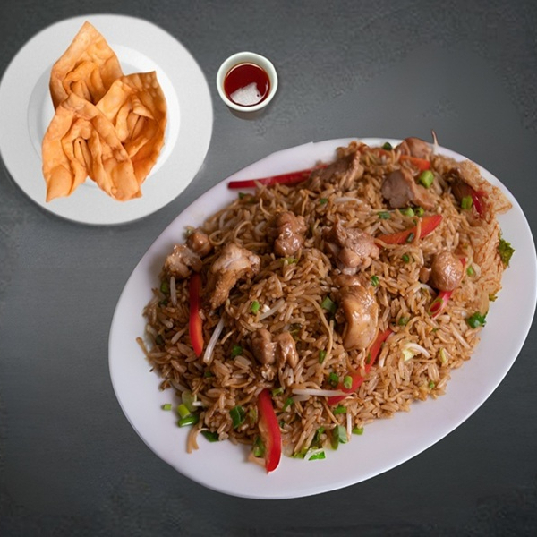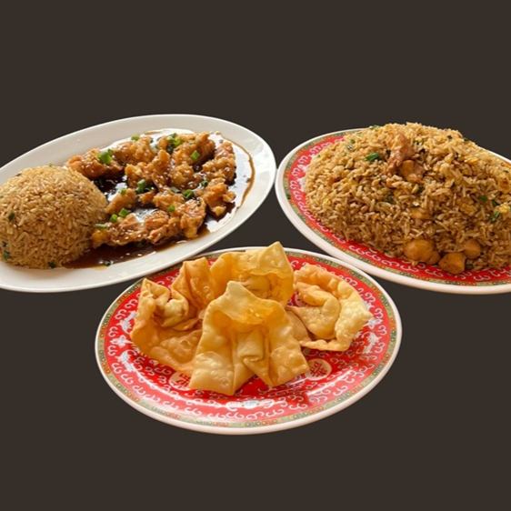 4 Wantanes crocantes rellenos + Chaufa de Pollo + Chijaukai con Chaufa (pollo marinado, empanizado y frito, bañado en salsa con semillas de ajonjolí).
