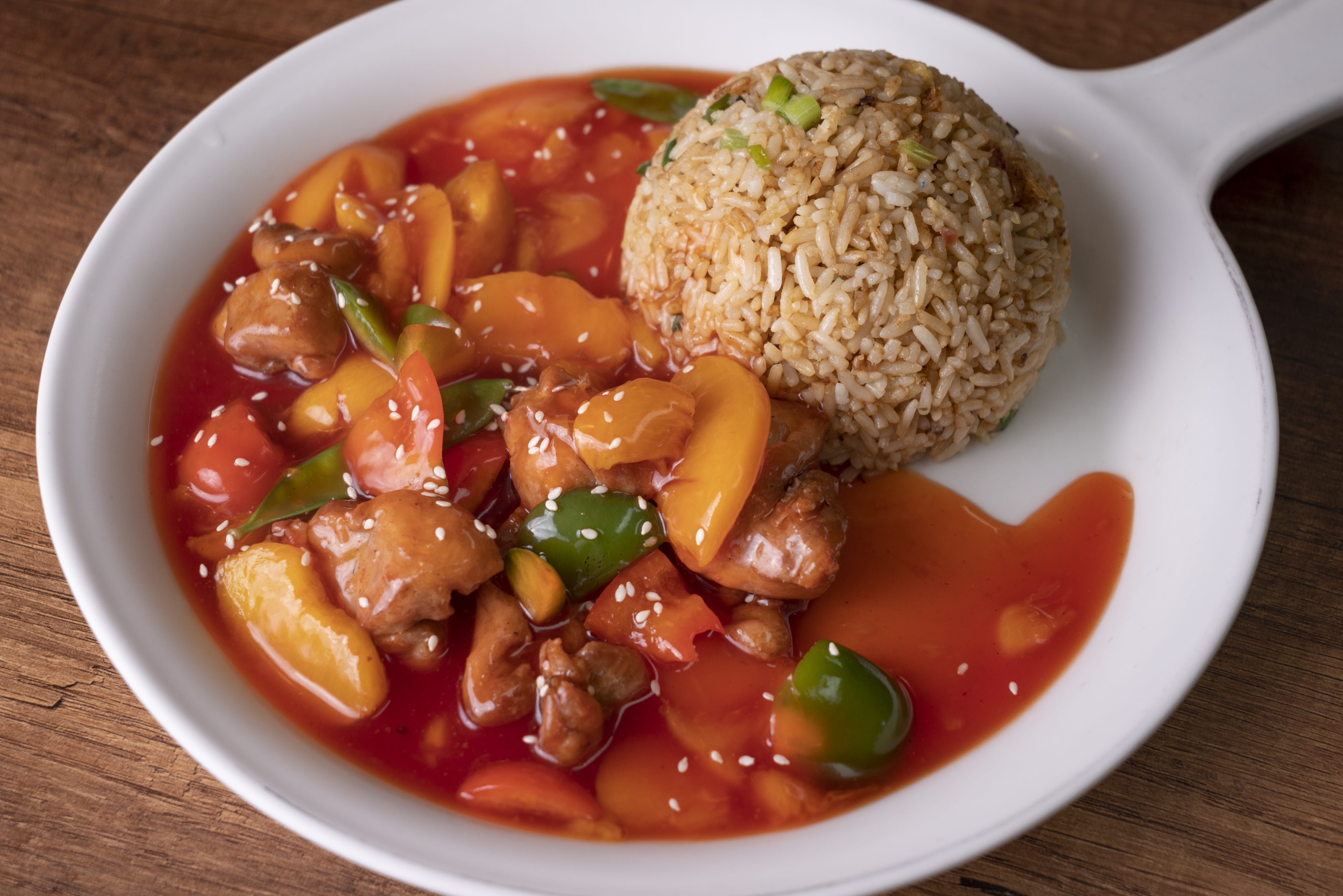 Pollo con Verduras + Chaufa + 3 Unidades de Wantan + Chicha Morada