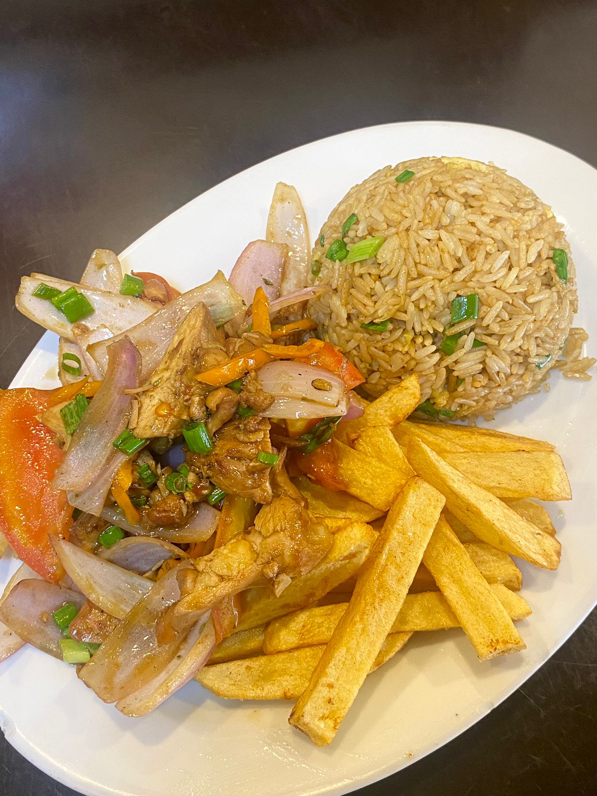 Pollo Saltado + Papas Fritas + Wantan +Bebida