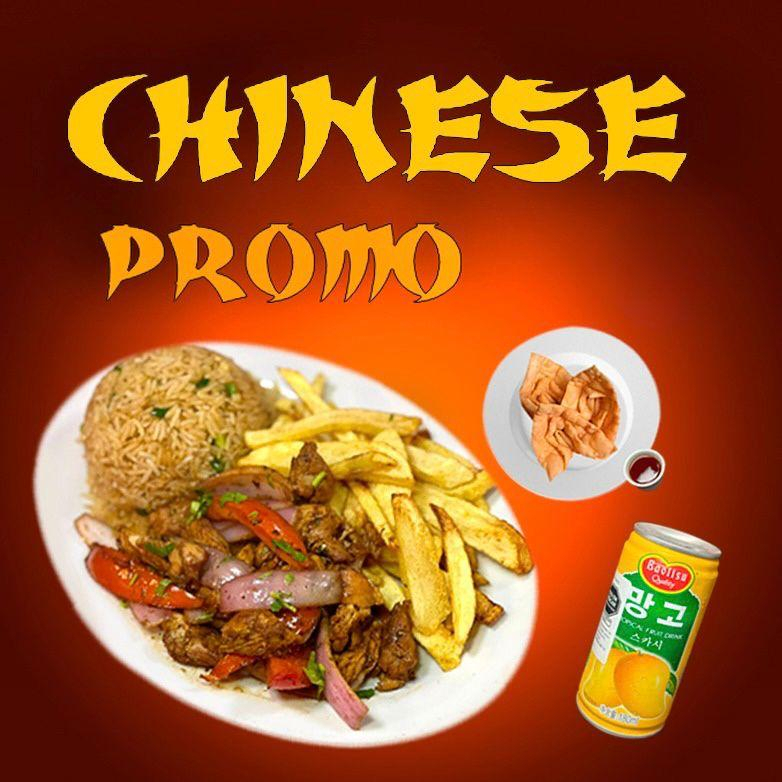 Pollo saltado con papas fritas + Wantan frito (3 unid) + Bebida tropical lata 180 ml