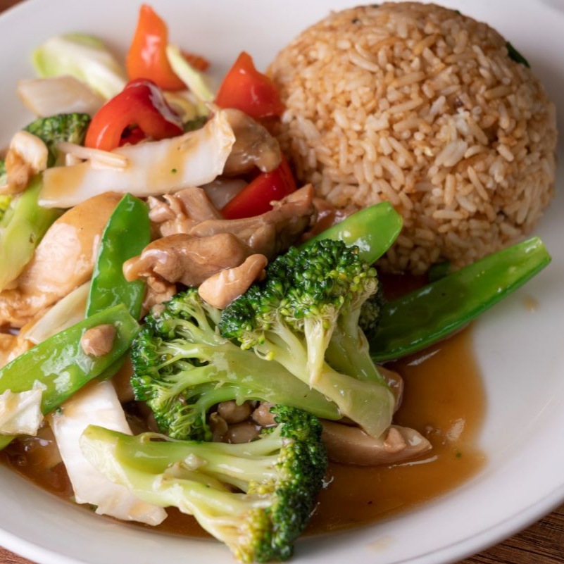 Pollo con Verduras + Chaufa + 3 Unidades de Wantan + Chicha Morada 330ml