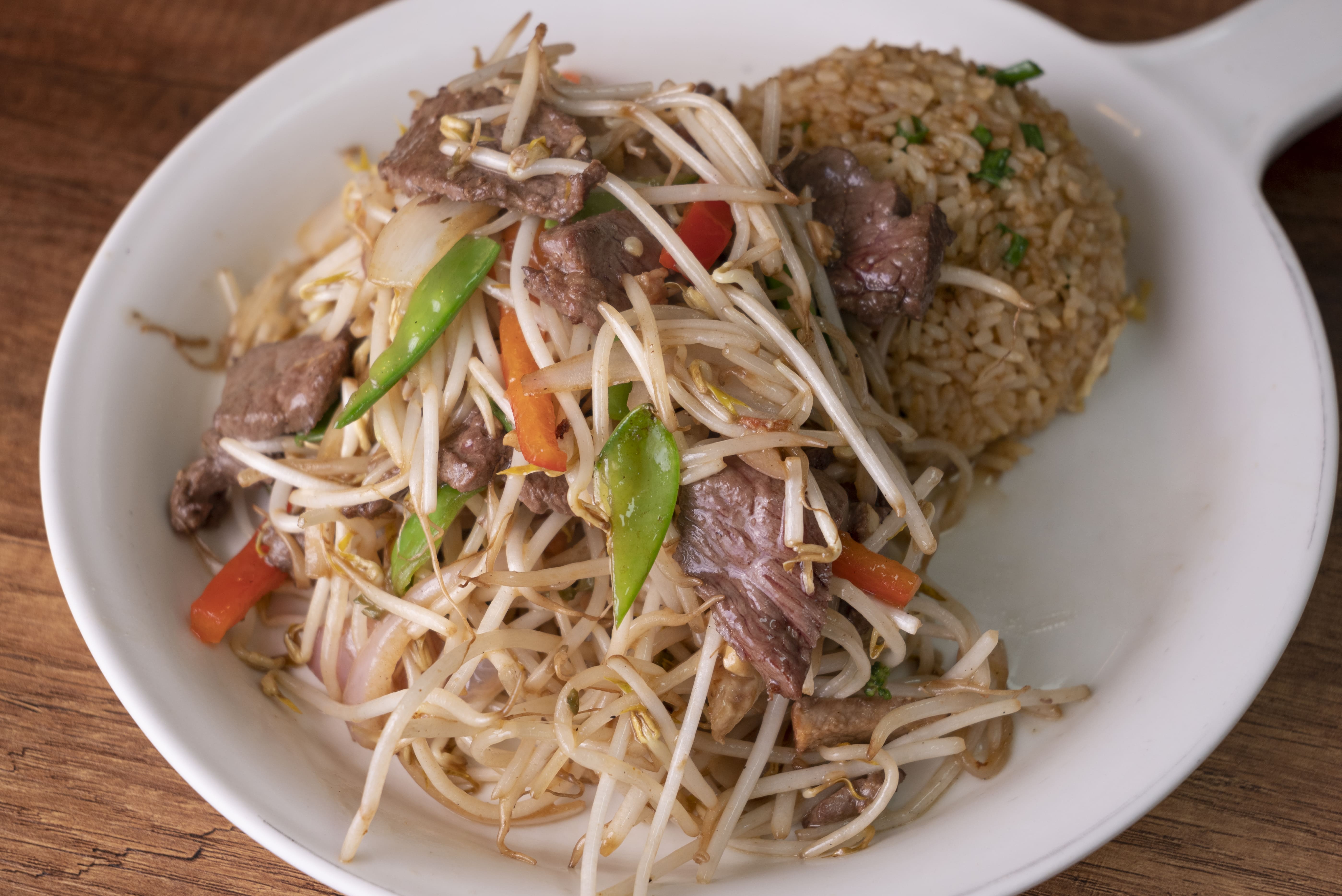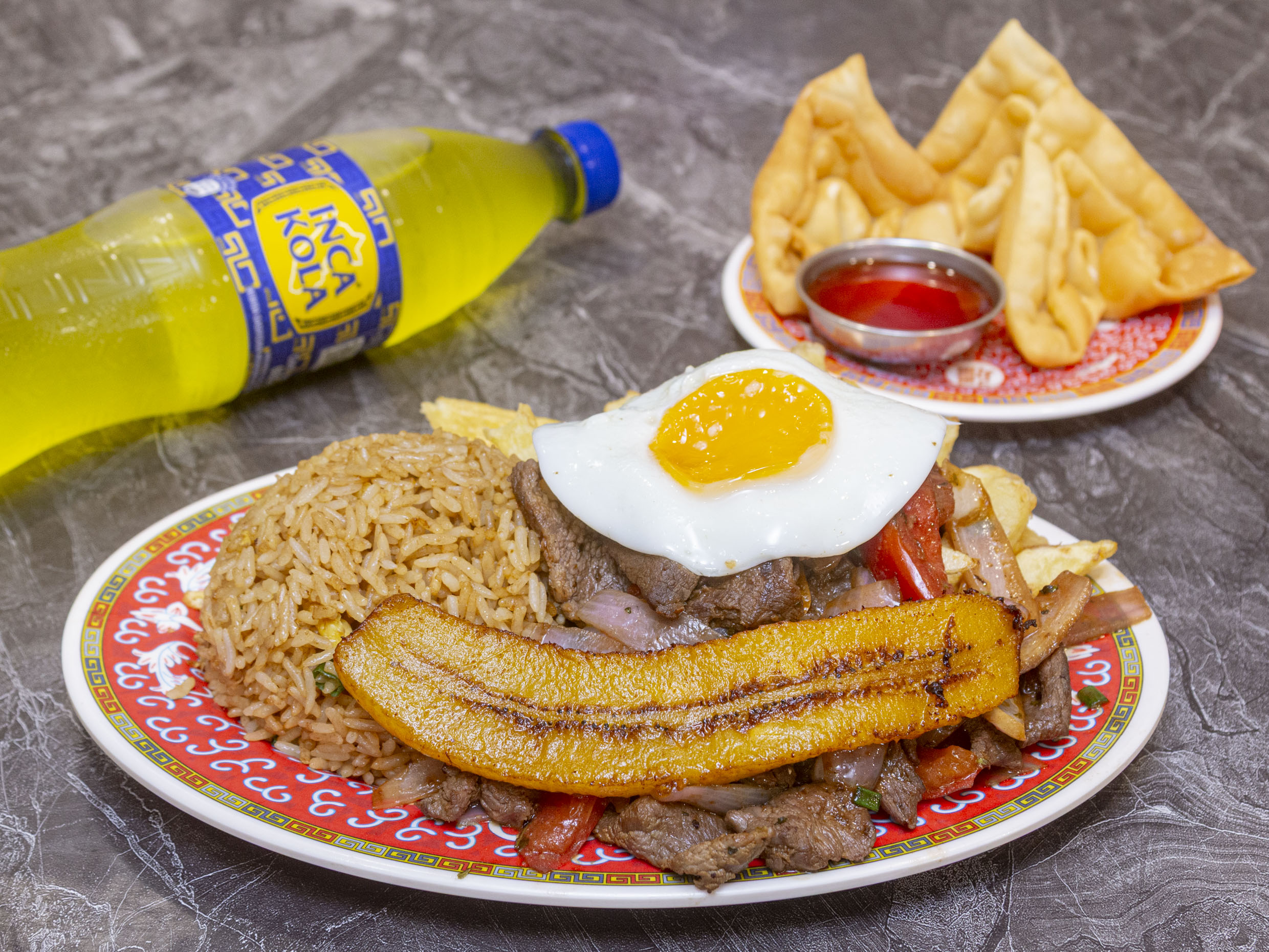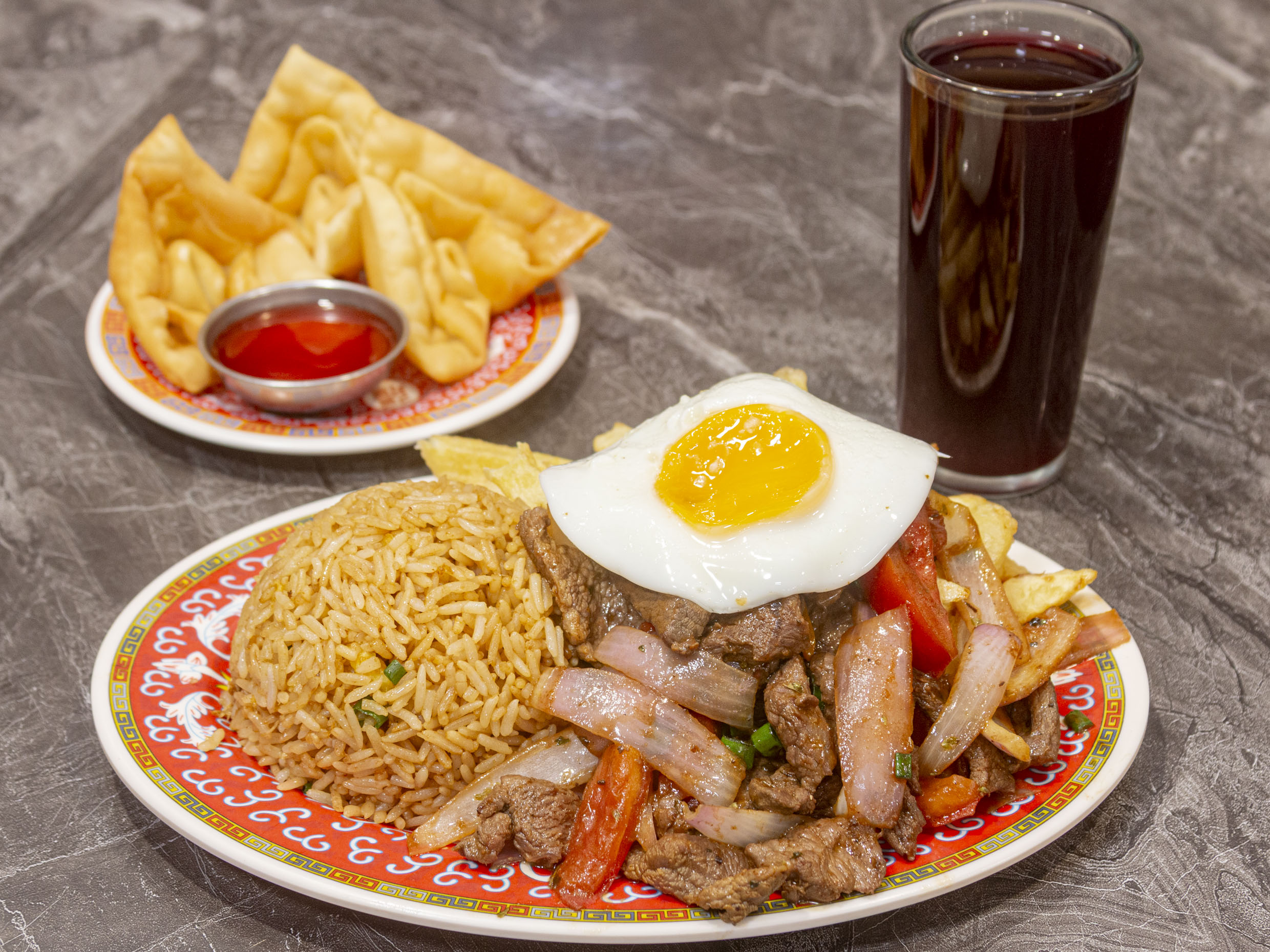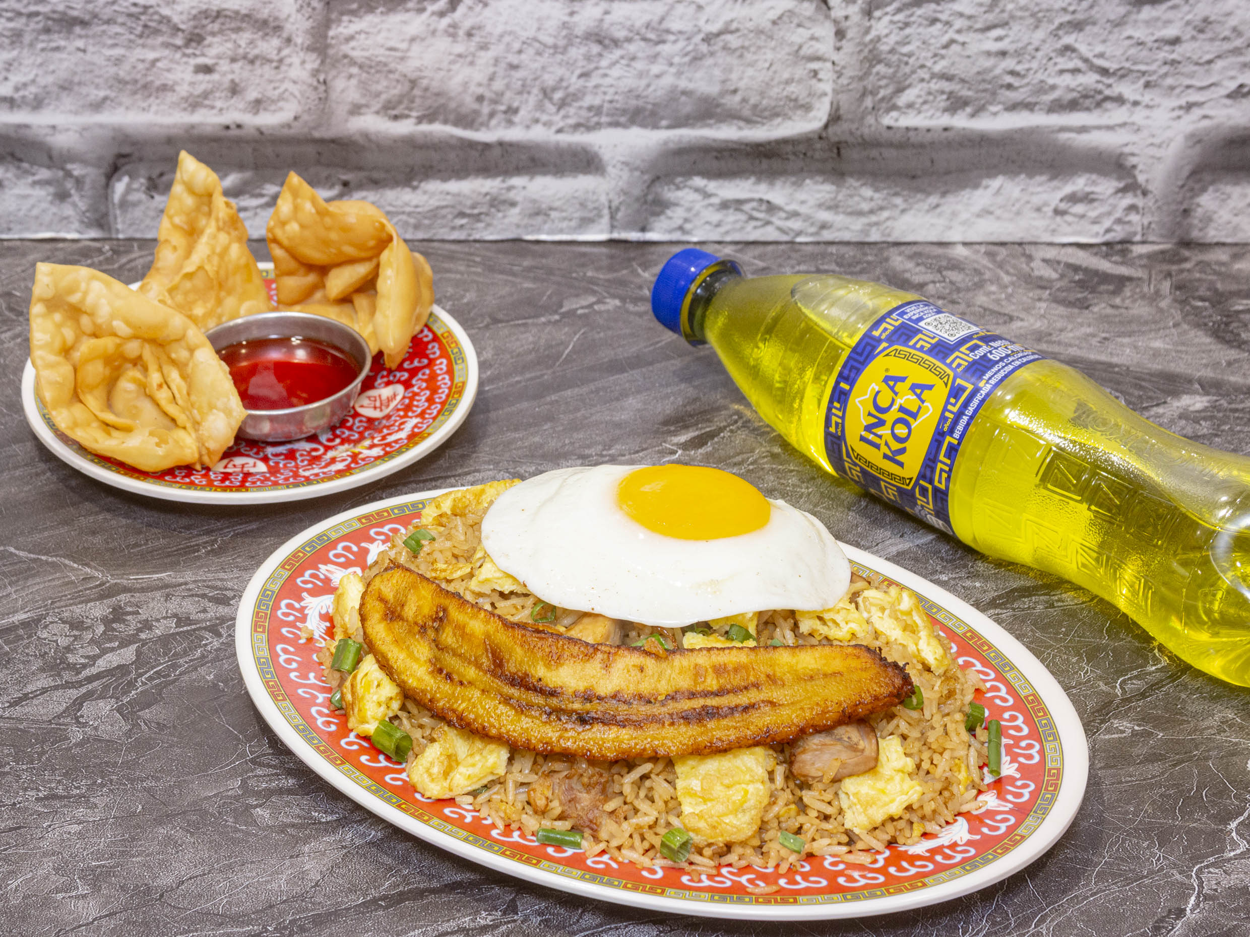 Lomo Saltado + arroz Chaufa + huevo y plátano + 3 Wantanes + Gaseosa