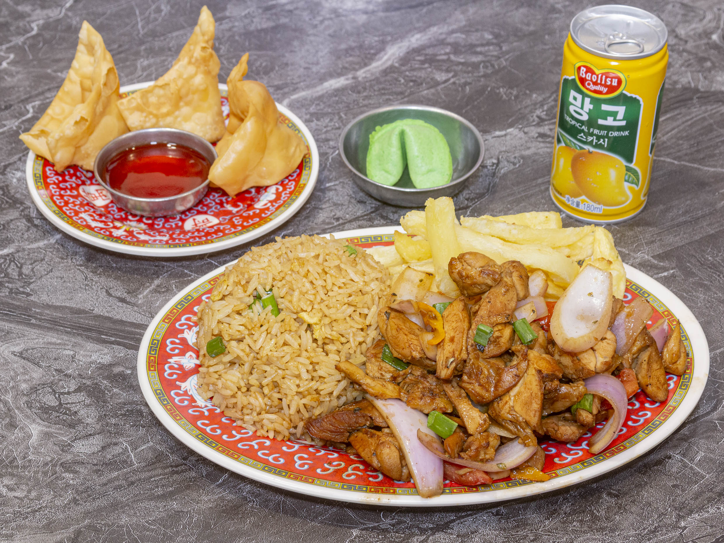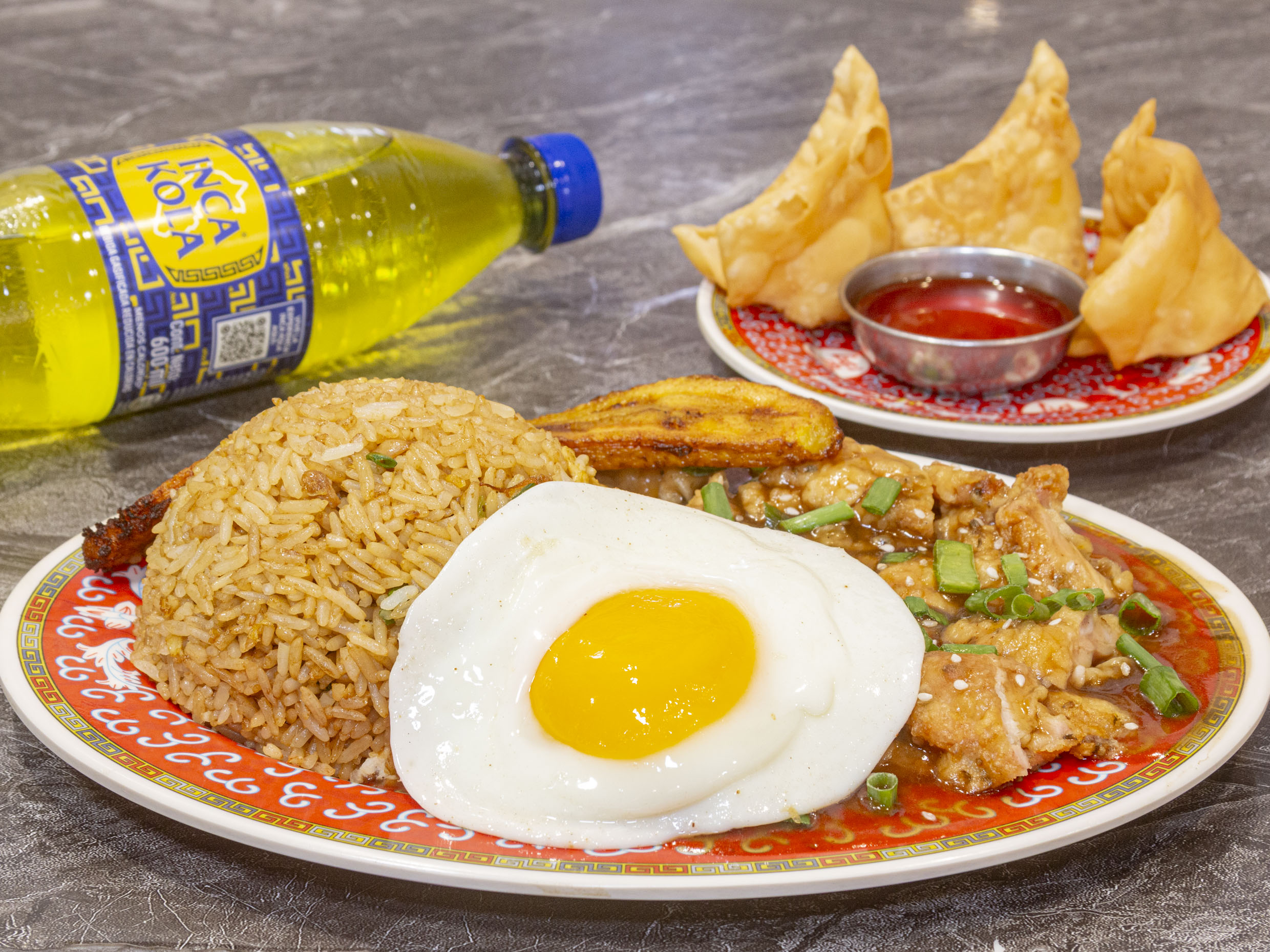 Chijaukai + arroz Chaufa + huevo y plátano + 3 Wantanes + Gaseosa