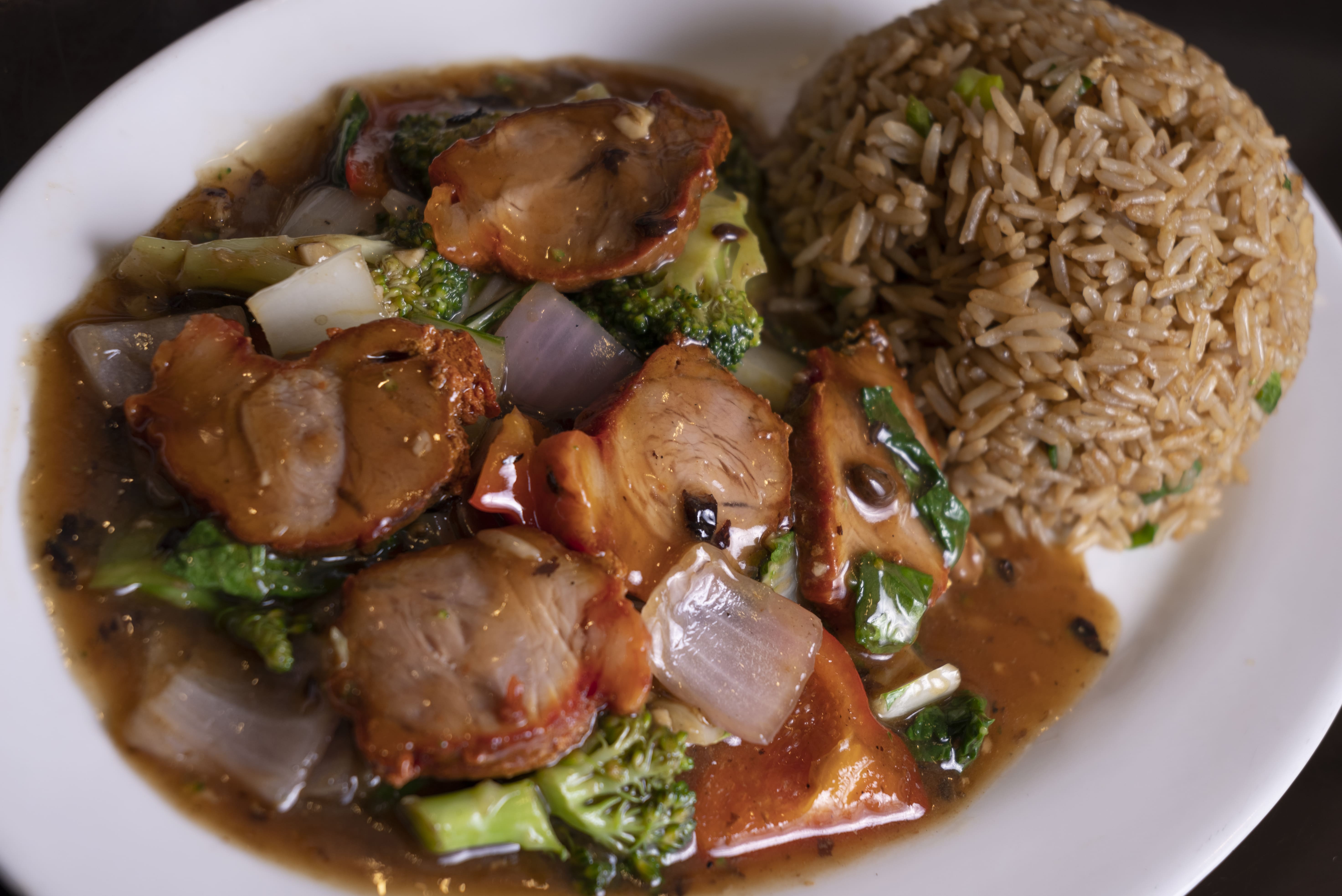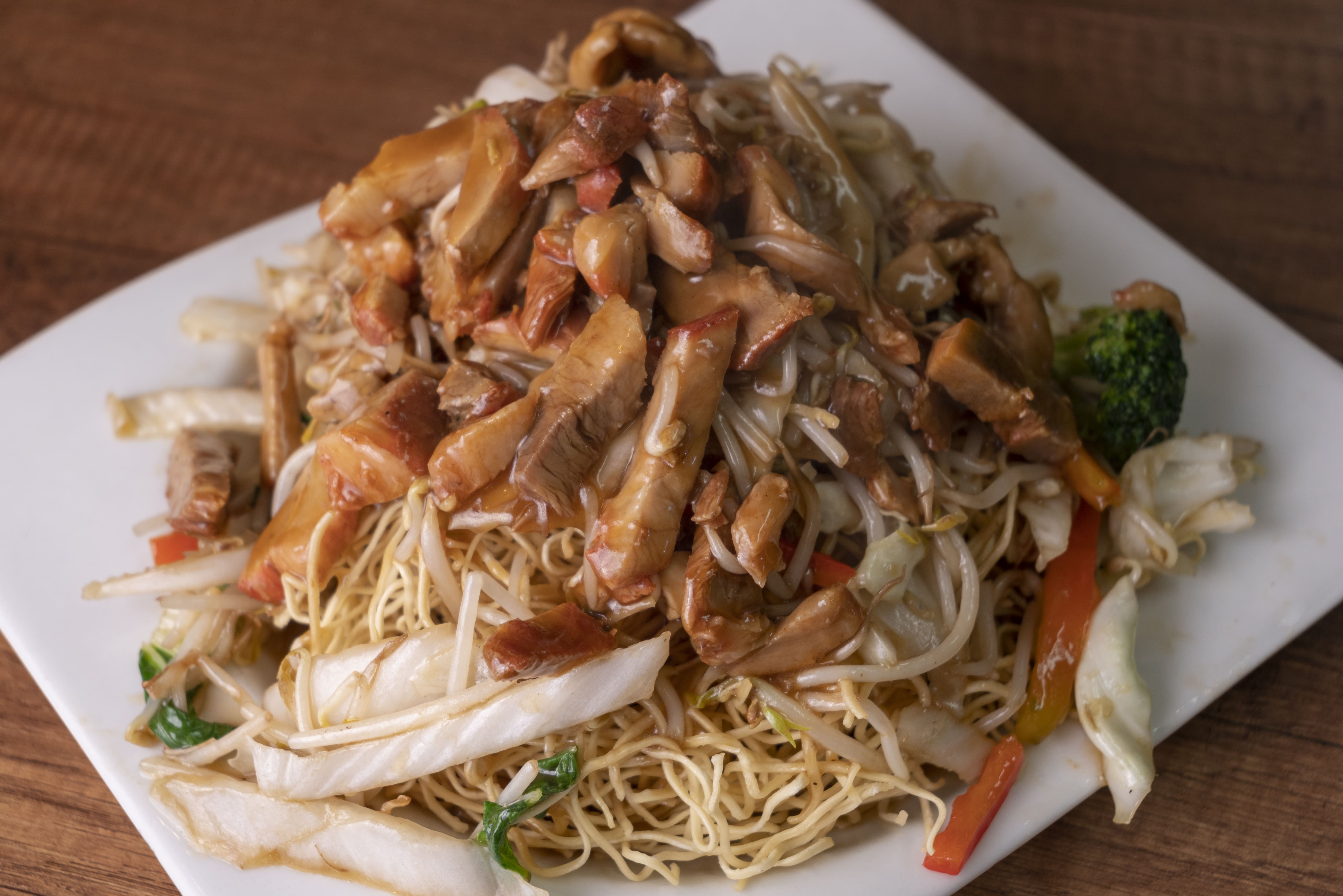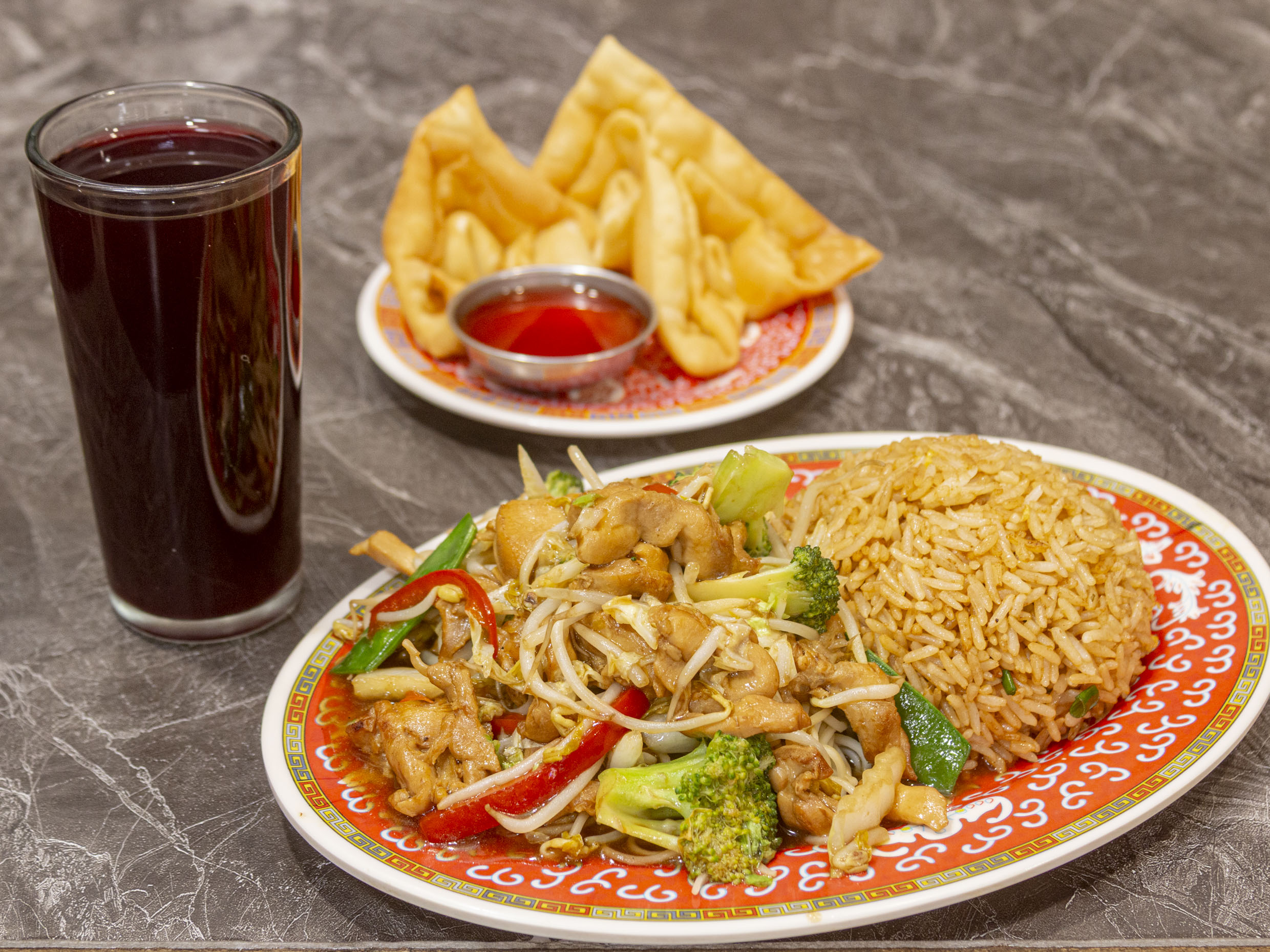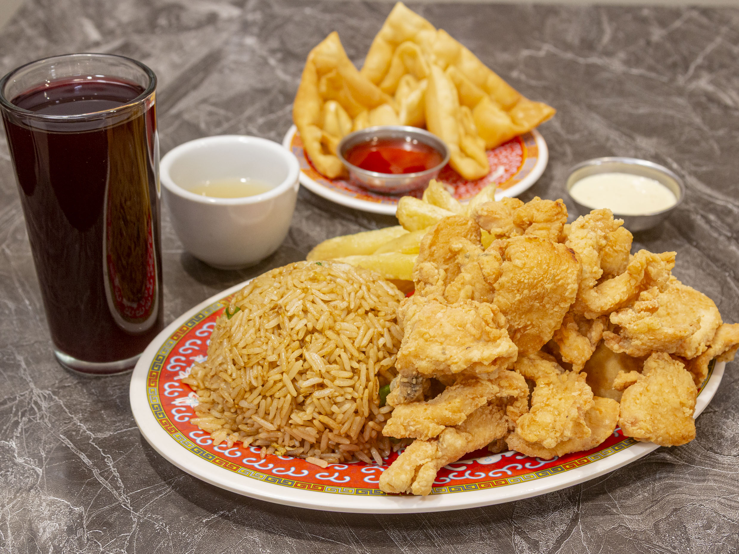 Chaufa de Pollo + Chijaukai con Chaufa (pollo marinado, empanizado y frito, bañado en salsa con semillas de ajonjolí) con 4 Wantanes crocantes rellenos